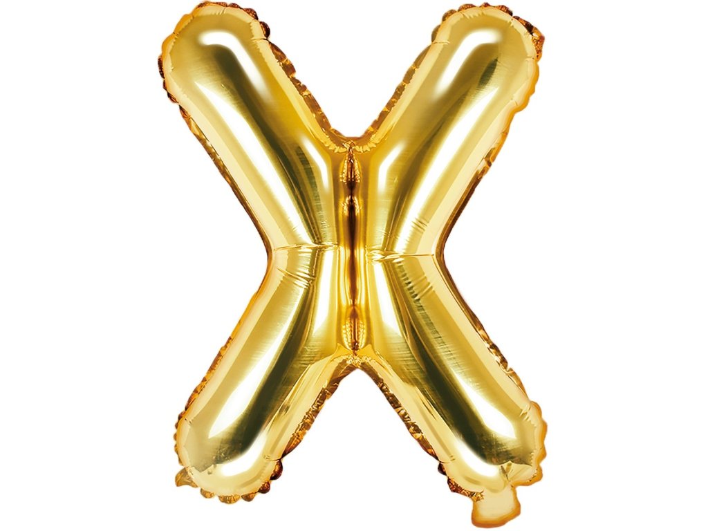 Metalický fóliový balónik písmeno ''X'', zlatý, veľkosť pred nafúknutím cca 40 cm, výška cca 35 cm. Nafúknite vzduchom.Dodatočné parametre