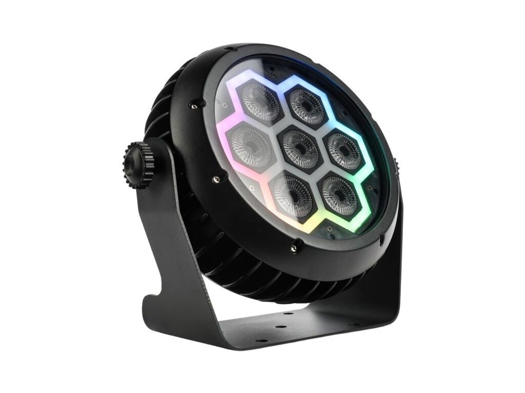 LIGHT4ME Frame PAR IP65 7x10W LED RGBW je profesionálny javiskový reflektor vybavený 7 výkonnými 10W RGBW LED diódami a 39 SMD LED diódami s krytím IP65, ktoré chránia proti poveternostným vplyvom a umožňuje jeho použitie vo vonkajších prostrediach. Reflektor ponúka uhol vyžarovania 26°, plný rozsah stmievača (0-100 %) a stroboskop s nastaviteľnou rýchlosťou 1-25 zábleskov za sekundu, čo zaisťuje flexibilné osvetlenie pre rôzne typy akcií.