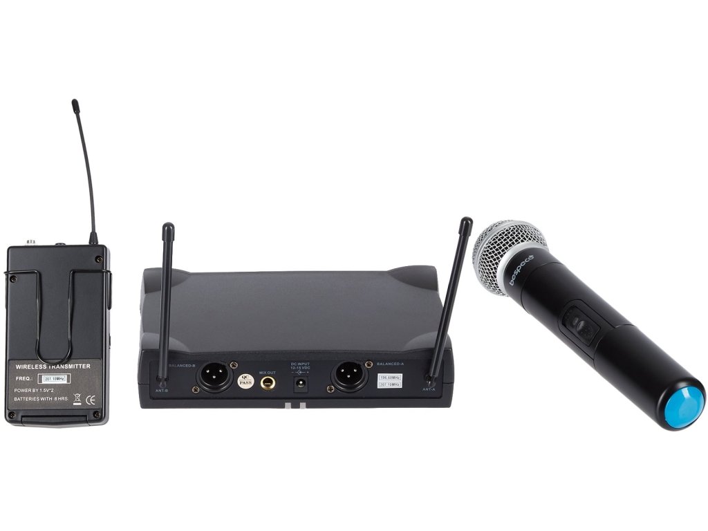 Duálny bezdrôtový set obsahujúci kondenzátorový hlavový a dynamický ručný mikrofón s VHF systémom vhodný pre moderátorov, karaoke párty, fitness inštruktorov, turistických sprievodcov, alebo spevácke live performance. Prijímač obsahuje pár integrovaných antén, dva ovládače hlasitosti jednotlivých kanálov na prednej strane. Zadný panel potom obsahuje dvojicu XLR výstupov a linkový výstup pre pripojenie do PA alebo mixpultu. Bezdrôtový prenos môže prebiehať na vzdialenosť až 50 m.