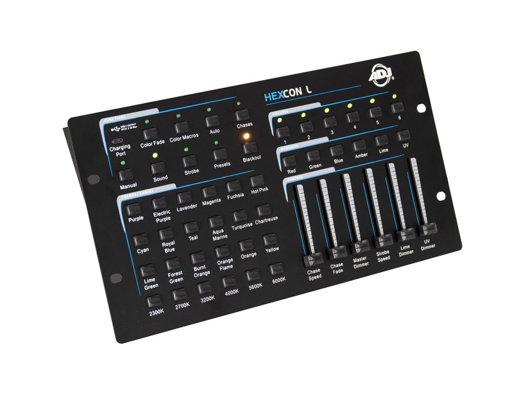 - Kompaktný DMX ovládač pre produkty ADJ radu HEX s RGBAL+UV