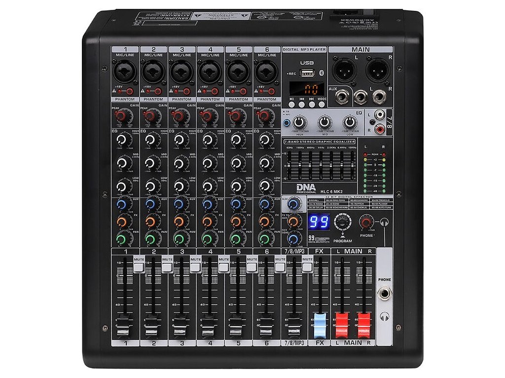 DNA HLC 6 MK2 je skvelou voľbou, ak hľadáte mobilný a cenovo dostupný mixážny pult. Umožňuje prehrávať súbory MP3, podporuje Bluetooth, takže hudbu môžete púšťať aj priamo zo svojho telefónu alebo iného prehrávača, disponuje vstavanými DSP multiefektmi a tiež prepínačom fantómového napájania +48V, ktorý je nevyhnutný pre prácu s kondenzátorovými mikrofónmi. Je to veľmi užitočné zariadenie ako pre domáce nahrávanie, tak pre profesionálne nahrávacie štúdio. Skvele sa osvedčuje aj počas hudobných koncertov, vystúpení, prezentácií a ako rozšírenie existujúcich ozvučovacích systémov. Ak nepotrebujete veľké, viac kanálové a zložité zariadenia, neváhajte a zvoľte DNA HLC 6 MK2.