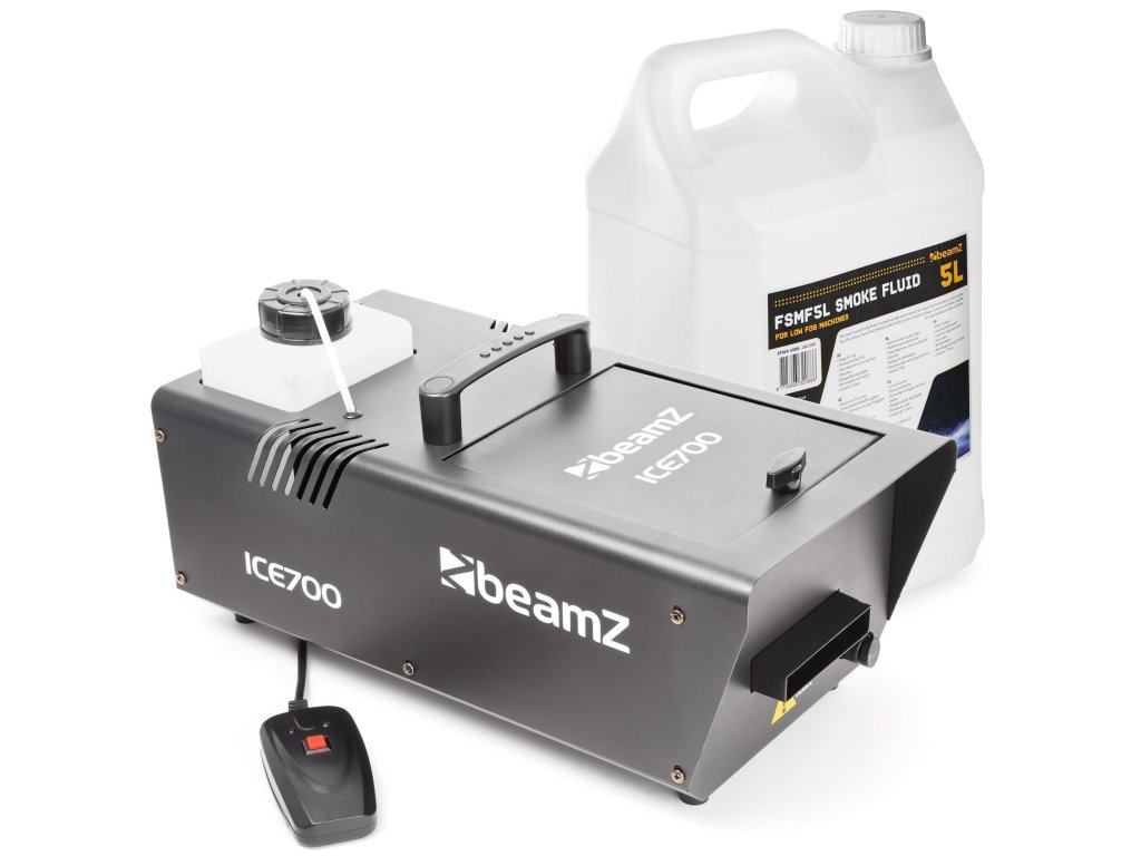 Výhodný set výrobníka nízkej plazivej hmly BeamZ ICE700 700W a kvapaliny pre výrobníky nízkej hmly BeamZ FSMF5L 5L.