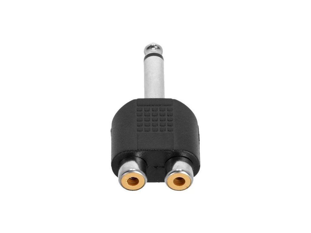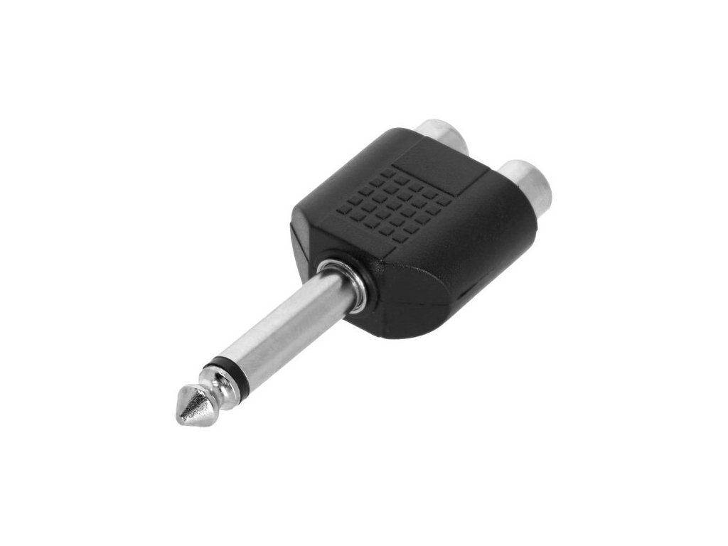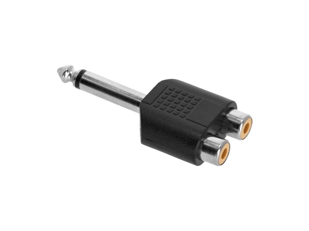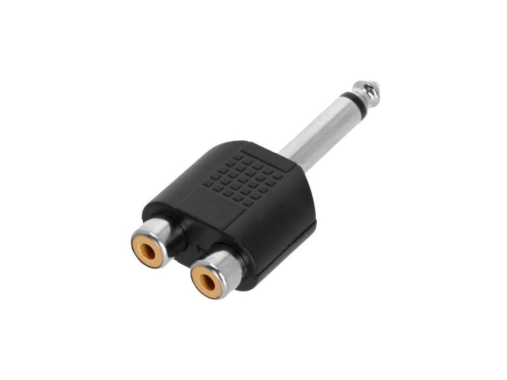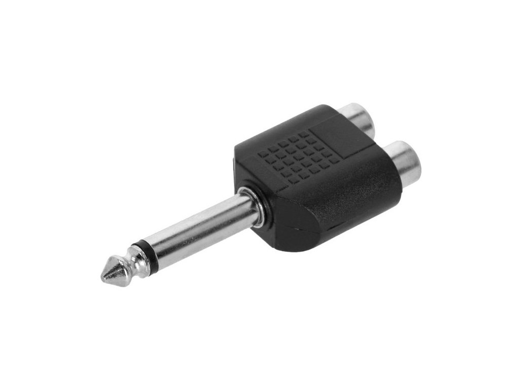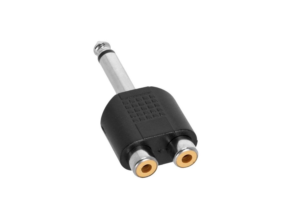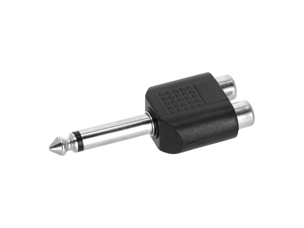 Y-adaptér pre 2 x phono samicu na 6,3 mm jack TS. Plastové puzdro. Poniklované kontakty. Veľmi ľahký a malý.