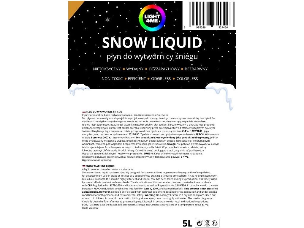 Náplň Light4Me do výrobníkov snehu 5l bola vyrobená vo Francúzsku popredným svetovým výrobcom kvapalín. Jej európsky pôvod zaručuje najvyššiu kvalitu a splnenie prísnych bezpečnostných noriem. Snehová kvapalina je ideálna pre osoby, ktoré ocenia spoľahlivosť a profesionalitu pri každodennom používaní. Vďaka náplni do snehu Light4Me získa každá oslava alebo akcia jedinečný charakter a atmosféru.
