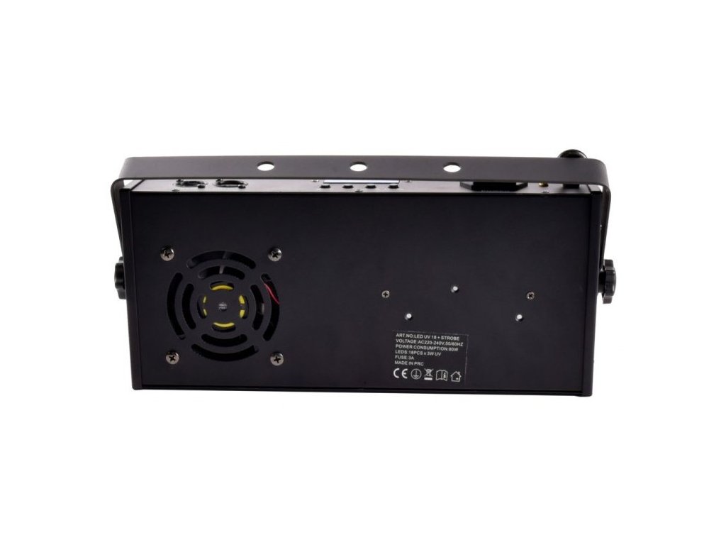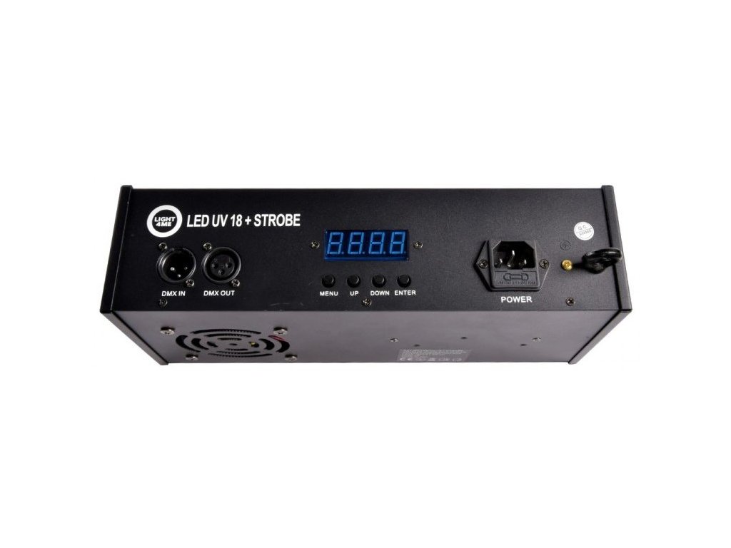 LIGHT4ME UV LED 18 + stroboskop, so silnými, 3W LED diódami, ktorých hlavnou úlohou je biele svetlo a ultrafialové svetlo. Prístroj sa výborne hodí do reštaurácií, tanečných klubov a diskoték, kde UV žiarenie vytvára efekt podobný fluorescencii niektorých farieb - najmä bielej.