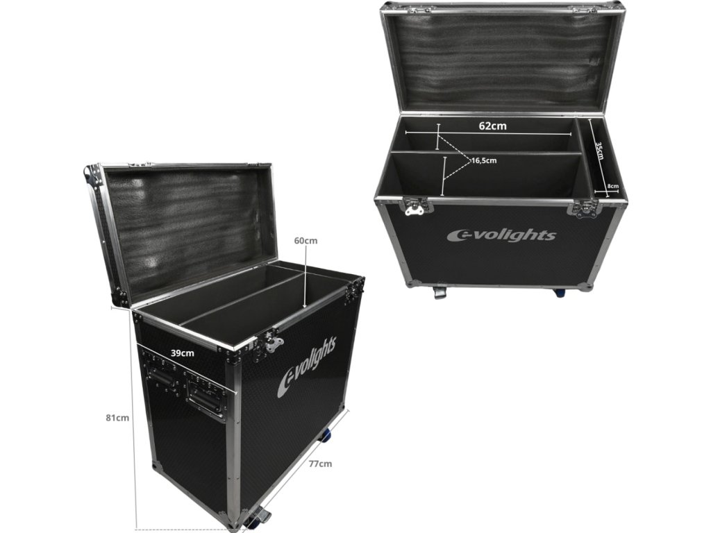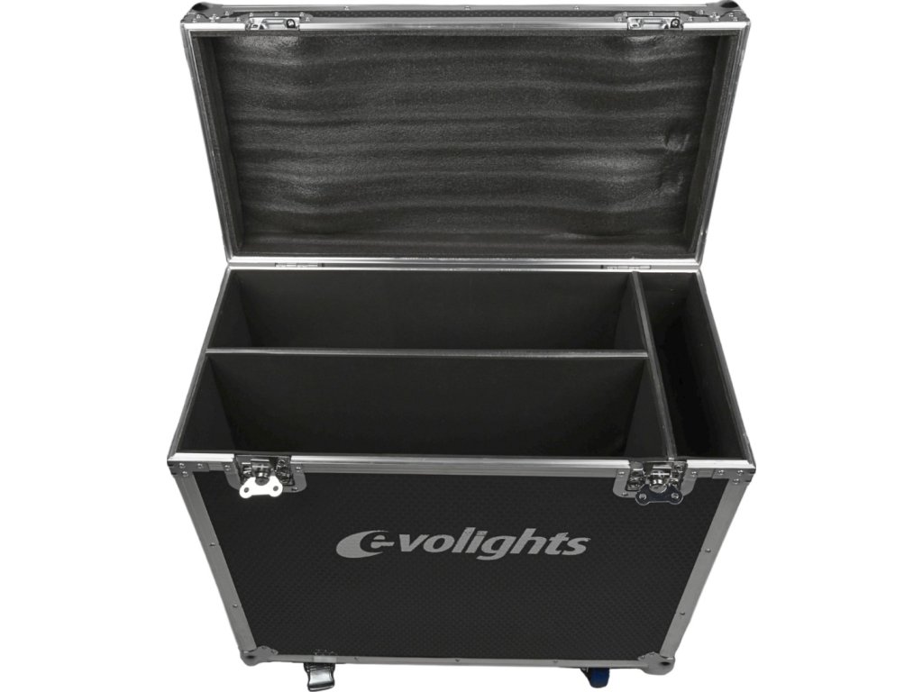 Evolights predstavuje kvalitu, užívateľský komfort a konkurencieschopnú cenu. Rovnako to platí aj pre tento prepravný kufor Lumen 7 kufor 2in1. Jeho veko je proti nechcenému otvoreniu zaistené dvoma robustnými motýlikovými zámkami. Otvára sa jednostranne do zvislej polohy a vďaka vhodnému uhlu sklonu nepadá na používateľa, čo zaisťuje ľahký a pohodlný prístup k uloženým zariadeniam. Vo vnútri sa nachádzajú dve komory dokonale prispôsobené reflektorom a priehradka na kabeláž a ďalšie príslušenstvo. Vnútro kufra je vystlané mäkkou technickou penou, vďaka čomu dokonale chráni uloženú techniku pred poškodením. Po stranách kufra sú pohodlné rukoväte umožňujúce ľahké prenášanie a na spodnej strane štyri otočné kolieska, z toho dve s brzdou. Lumen 7 kufor 2in1 je na mieru strihaný prepravný kufor pre reflektory Lumen 7 značky Evolights.