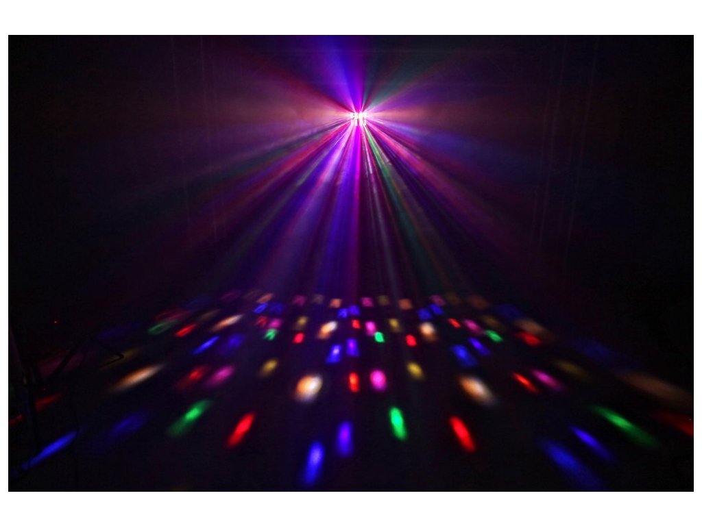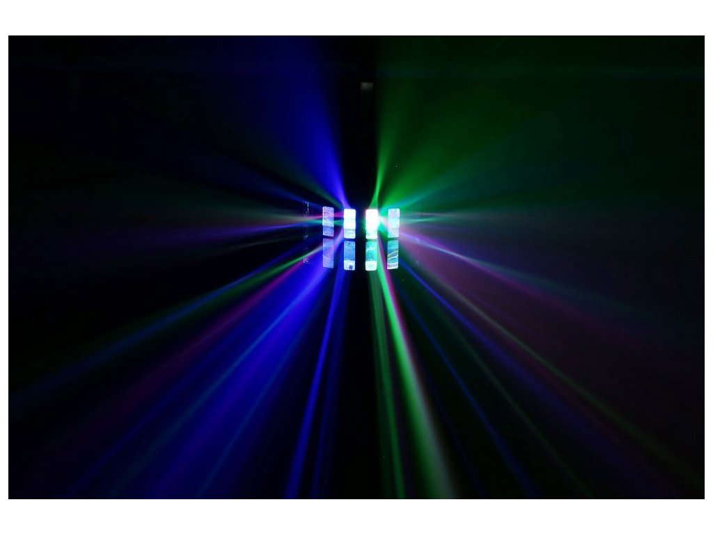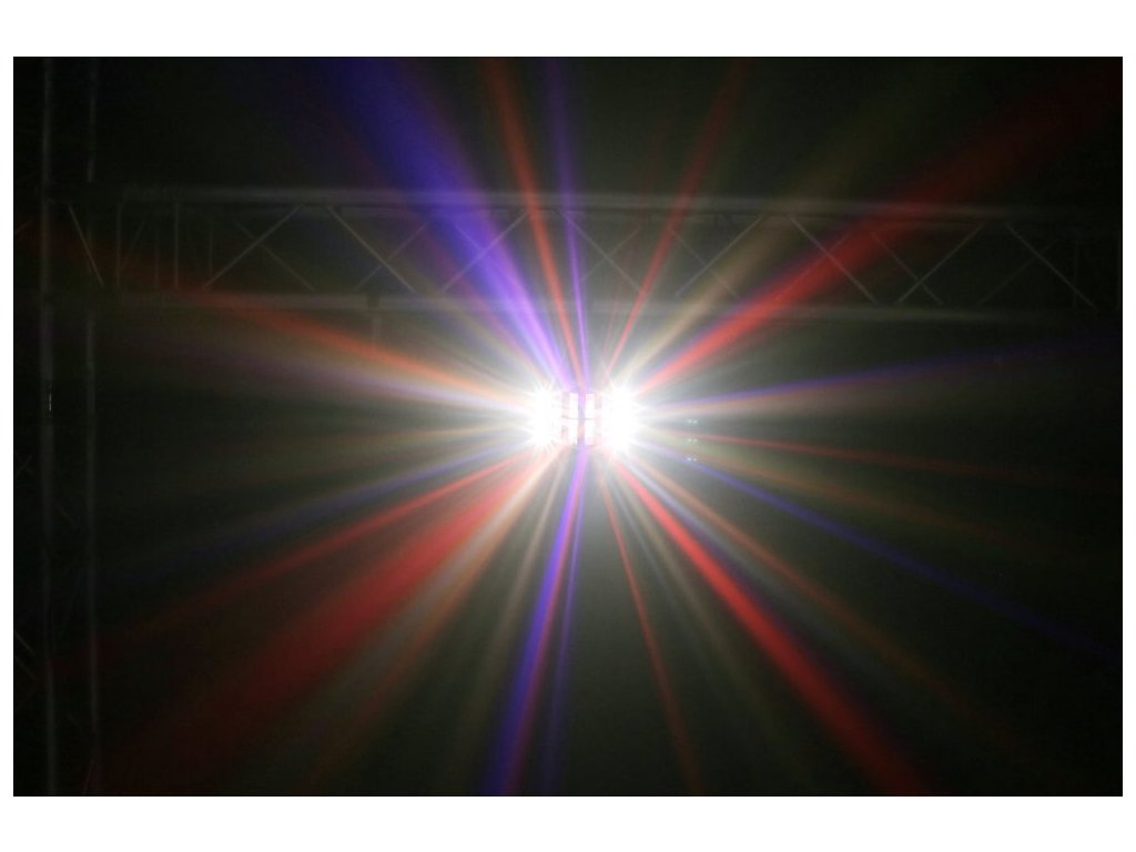 Hybridný LED svetelný efekt kombinuje dve zariadenia v jednom prístroji. Klasický LED lúčový efekt dopĺňa výkonný UV/W stroboskop. Automatický prevádzkový režim, ovládanie DMX signálom alebo hudbou pomocou zabudovaného mikrofónu, funkcia Master/Slave. Dodávané vrátane IR diaľkového ovládača.