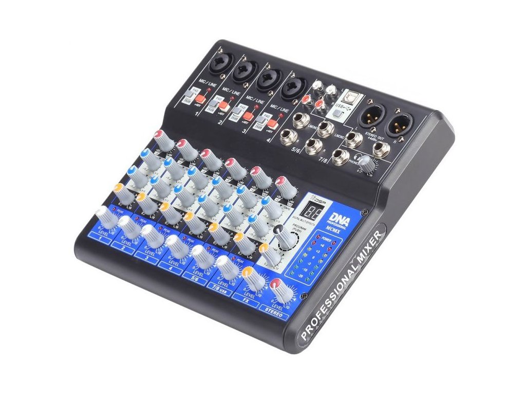 DNA MC08X je 8-kanálový analógový audio mixážny pult od DNA. Pult je vybavený 8 linkovými vstupmi (4 mono a 2 stereo), 2 symetrickými XLR výstupmi s vysoko kvalitnými predzosilňovačmi, USB portom, Phantom + 48V napájacím zdrojom (samostatný pre každý kanál!) A procesorom s rozšírenými efektmi (DSP). Kanály 7 a 8 boli navyše rozšírené o konektory cinch, vďaka ktorým môžeme ku konzole pripojiť ďalšie periférne zariadenia.