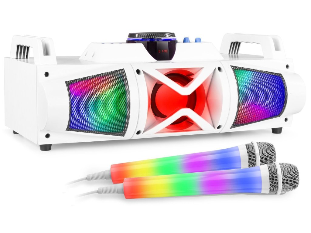Výhodný set pre karaoke, ktorý sa skladá z Fenton MDJ160W Party reobroboxu 2.1 150W s batériou v bielej farbe a 2ks Fenton KMD55W Karaoke mikrofónu s RGB osvetlením v bielej farbe.