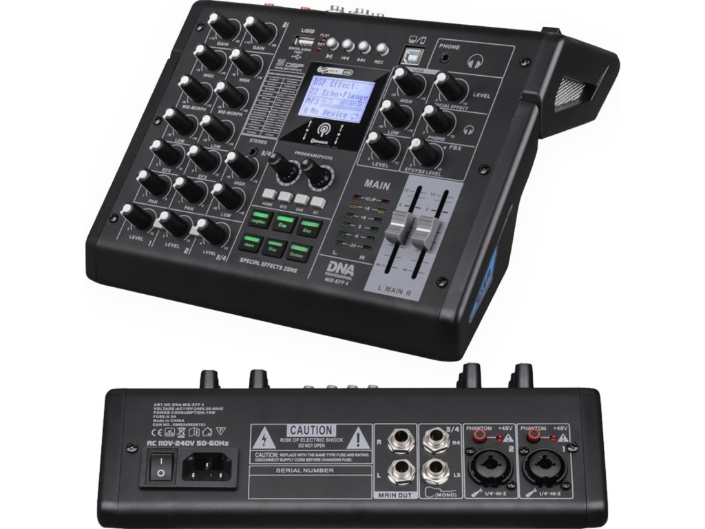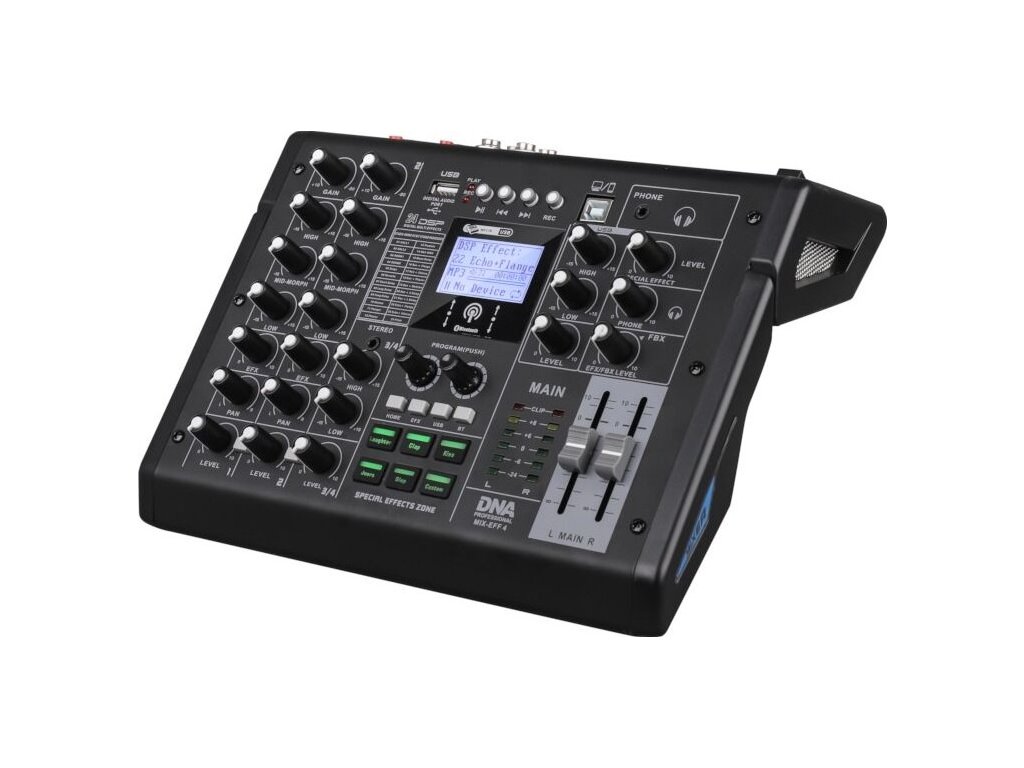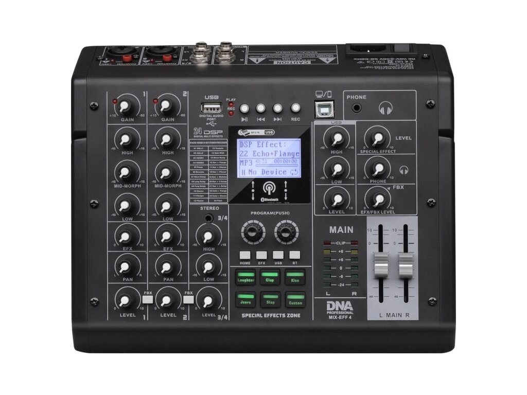 DNA MIX-EFF 4 je kompaktný, a napriek tomu multifunkčný analógový audio mixážny pult, ktorý sa osvedčí v každej situácii vyžadujúcej spoľahlivé spracovanie zvuku. Je vybavený 4 kanálmi a dvoma symetrickými combo vstupmi XLR/jack 6,35 mm, dvoma vstupmi jack 6,35 mm, stereo vstupom jack 3,5 mm, dvoma výstupmi jack 6,35 mm a slúchadlovým výstupom jack 3,5 mm, čo umožňuje flexibilné pripojenie mikrofónov, nástrojov a ďalších externých audio zariadení. Vstavaný prehrávač audio súborov – využívajúci porty USB-A pre externú pamäť a USB-B pre pripojenie k počítaču alebo smartfónu – a štandard bezdrôtovej komunikácie Bluetooth umožňujú rýchle prehrávanie a nahrávanie zvuku bez zbytočnej kabeláže. DNA MIX-EFF 4 je ideálnym riešením pre DJov, domáce nahrávacie štúdiá, skúšobne a tiež pre organizátorov živých akcií.