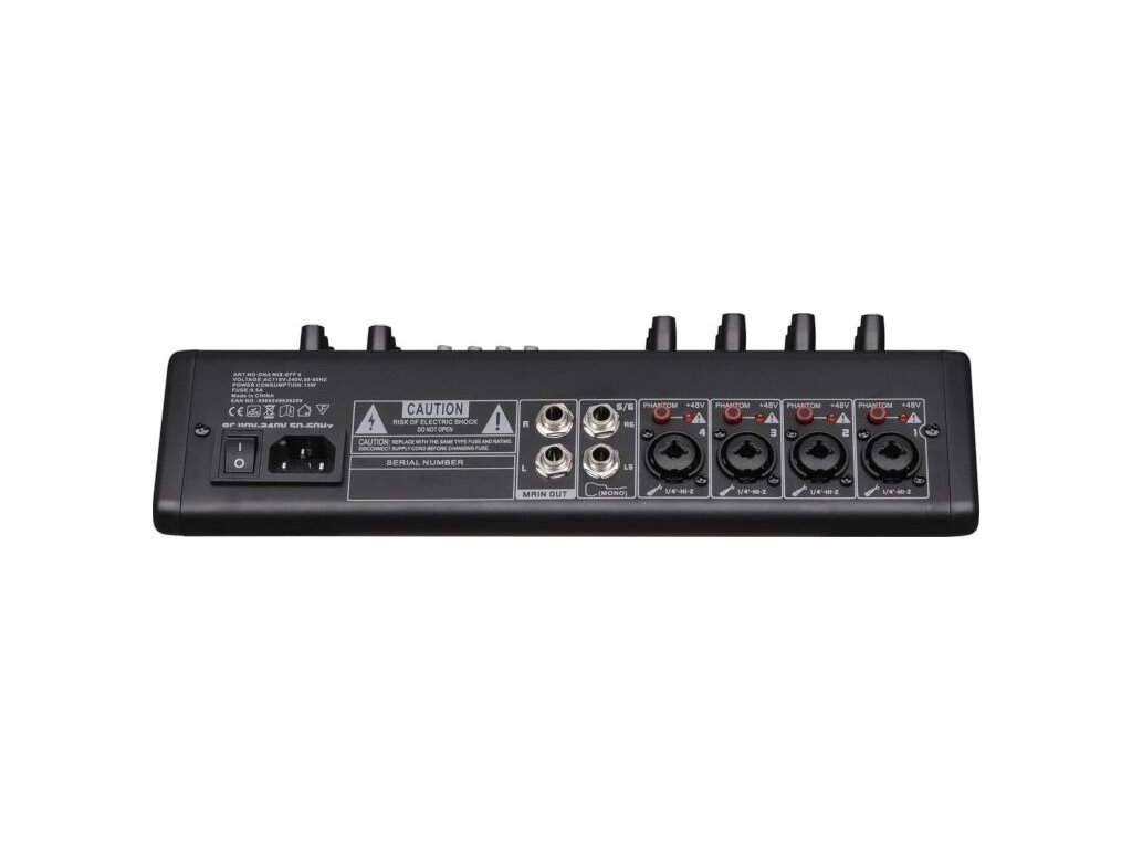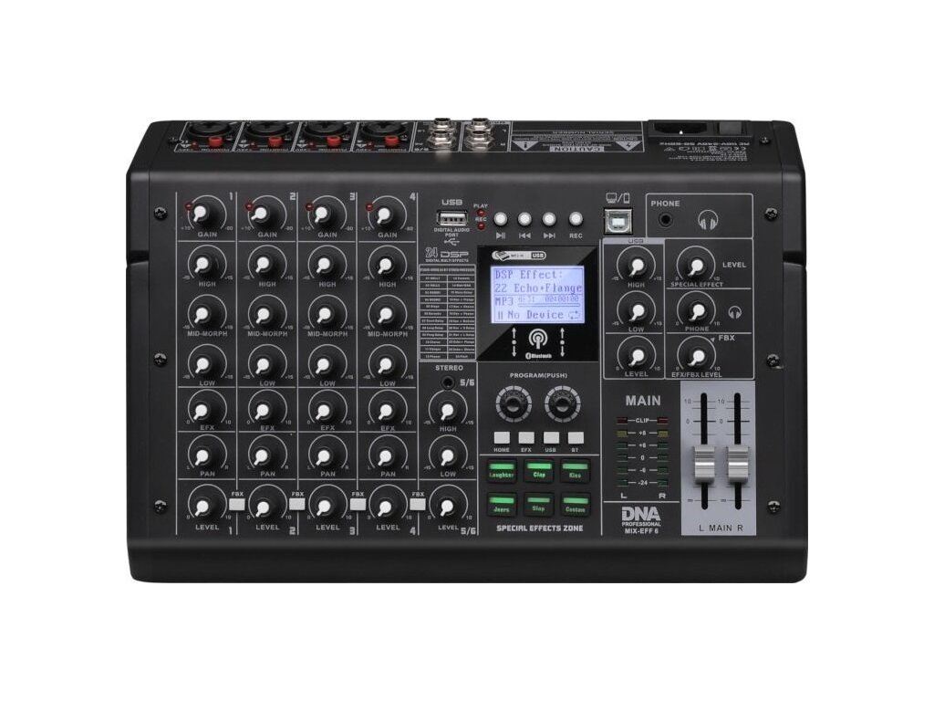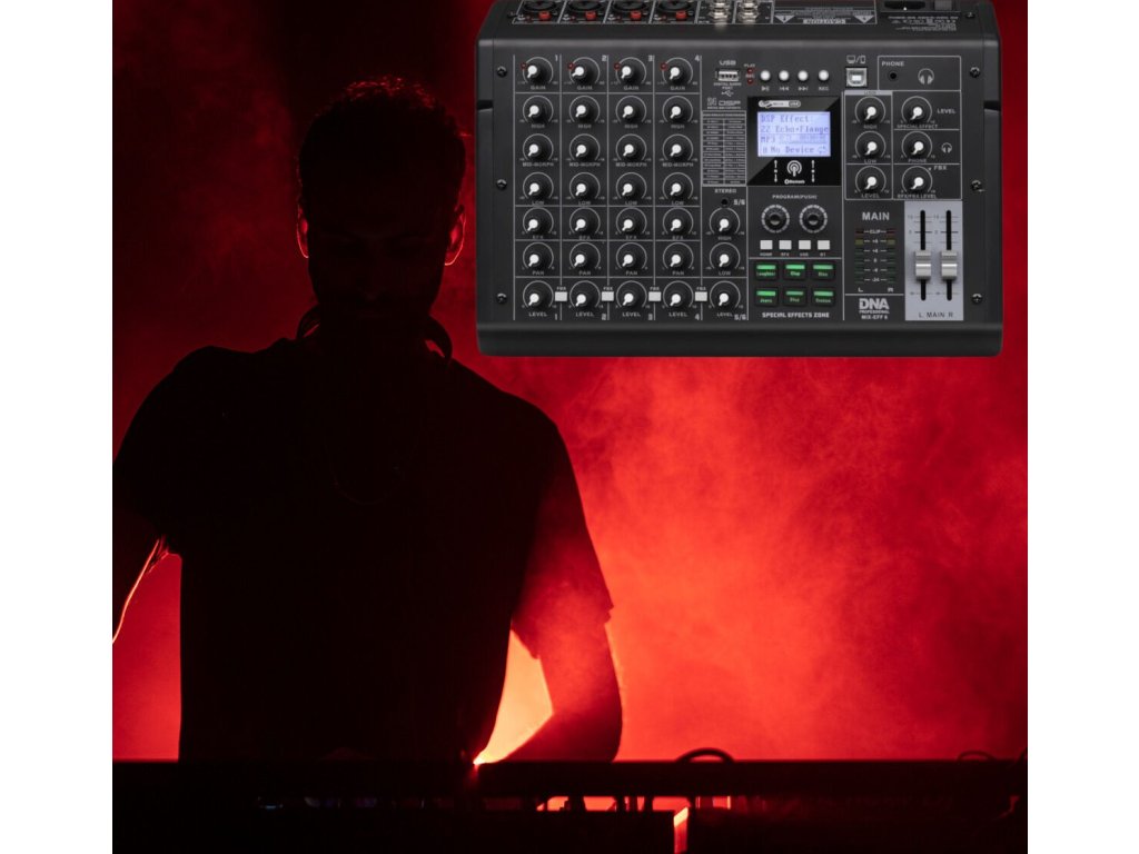 DNA MIX-EFF 6 je kompaktný, a napriek tomu multifunkčný analógový audio mixážny pult, ktorý sa osvedčí v každej situácii vyžadujúcej spoľahlivé spracovanie zvuku. Je vybavený 6 kanálmi a štyrmi symetrickými combo vstupmi XLR/jack 6,35 mm, dvoma vstupmi jack 6,35 mm, stereo vstupom jack 3,5 mm, dvoma výstupmi jack 6,35 mm a slúchadlovým výstupom jack 3,5 mm, čo umožňuje flexibilné pripojenie mikrofónov, nástrojov a ďalších externých audio zariadení. Vstavaný prehrávač audio súborov – využívajúci porty USB-A pre externú pamäť a USB-B pre pripojenie k počítaču alebo smartfónu – a štandard bezdrôtovej komunikácie bluetooth umožňujú rýchle prehrávanie a nahrávanie zvuku bez zbytočnej kabeláže. DNA MIX-EFF 6 je ideálnym riešením pre DJov, domáce nahrávacie štúdiá, skúšobne a tiež organizátorov živých akcií.