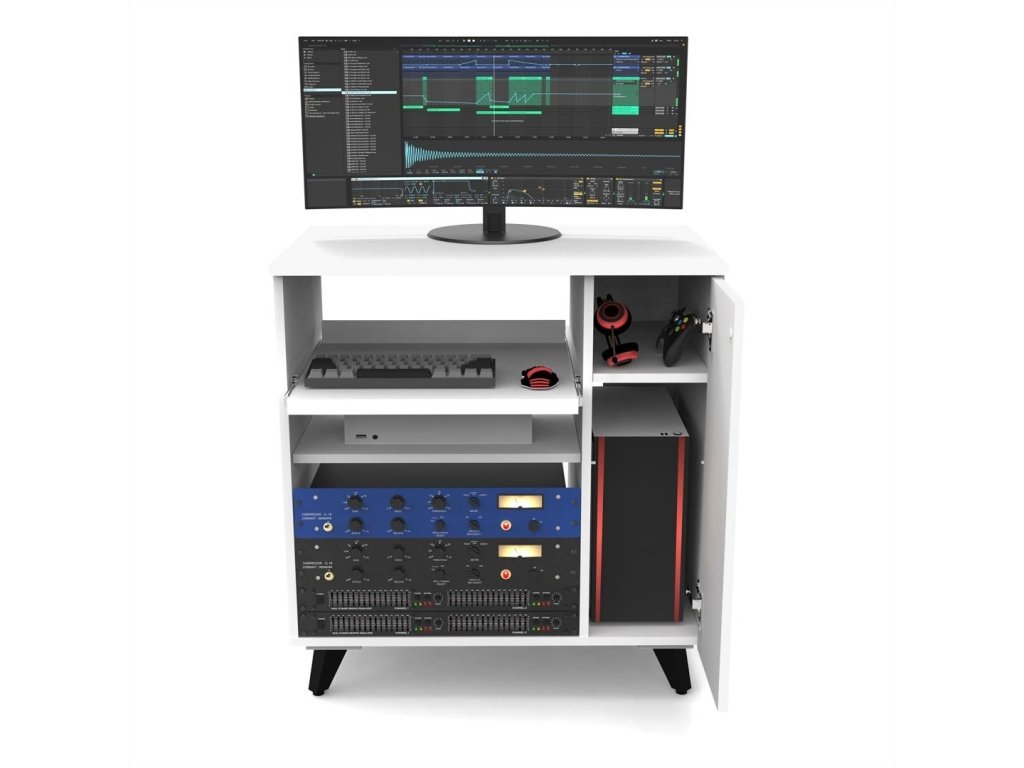 Žiadne dve nahrávacie štúdiá nie sú rovnaké, a preto bol Glorious Modular Side Rack navrhnutý s ohľadom na maximálnu flexibilitu. Tento štýlový štúdiový nábytok predstavuje variabilný regál rozdelený na dve hlavné časti, ktorý perfektne doplní výrobky rady Soud Desk a Wokbench. Väčšiu (ľavú) časť tvorí rackový priestor (až 12U), ktorý je možné z časti využiť na inštaláciu dvoch policových dielov, z ktorých jeden je vybavený praktickým výsuvným mechanizmom. Oba diely je možné výškovo nastaviť alebo zvoliť iba jeden (či žiadny) a uprednostniť tak priestor najmä pre rackové jednotky. To, ako si rozloženie navrhnete, potom priamo určuje možnosti usporiadania vášho vybavenia, kedy na pevný policový diel umiestnite zariadenie, ku ktorému nepotrebujete trvalý prístup, zatiaľ čo výsuvnú podložku využijete napr. pre kontroléry, drum machines, klávesnicu alebo napríklad gramofón. Pravú časť komody tvorí užší dvierkami uzatvárateľný priestor, ktorý je zamýšľaný buď na uloženie LP dosiek alebo umiestnenie počítača. Menšia polička poslúži na odkladanie príslušenstva (napr. slúchadlá). Horná doska je potom k dispozícii pre ďalšie potreby. Regál môžete doplniť o robustné kovové nožičky alebo naskrutkovať pojazdné kolieska, ak potrebujete nábytkom pohybovať. Obe možnosti sú súčasťou dodávky, rovnako ako všetok montážny materiál. Samotná montáž je veľmi jednoduchá. Komoda sa dodáva v troch farebných prevedeniach (čierna, biela, orech) a v rámci voliteľného príslušenstva ju možno doplniť o prídavnú dosku, ktorá môže Modular Side Rack prepojiť s ostatnými výrobkami rady Sound Desk a Workbench.