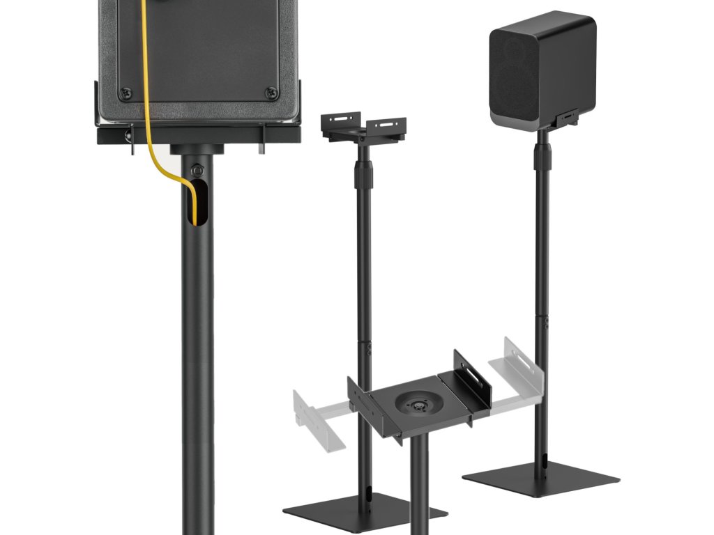 Platformu je možné ľahko otáčať o 360° a naklápať o 10° vertikálne aj horizontálne, čo vám umožní dosiahnuť ideálny posluchový bod (sweet spot). Integrované duté priestory v trubiciach stojana aj základni slúžia na diskrétne vedenie káblov, čím udržujú vaše pracovné prostredie čisté a organizované.