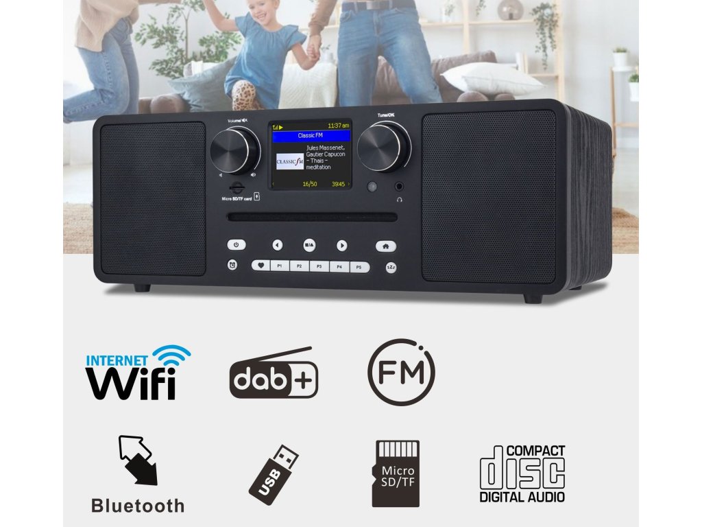 - DAB+ / FM rádio / internetové rádio / CD prehrávač
