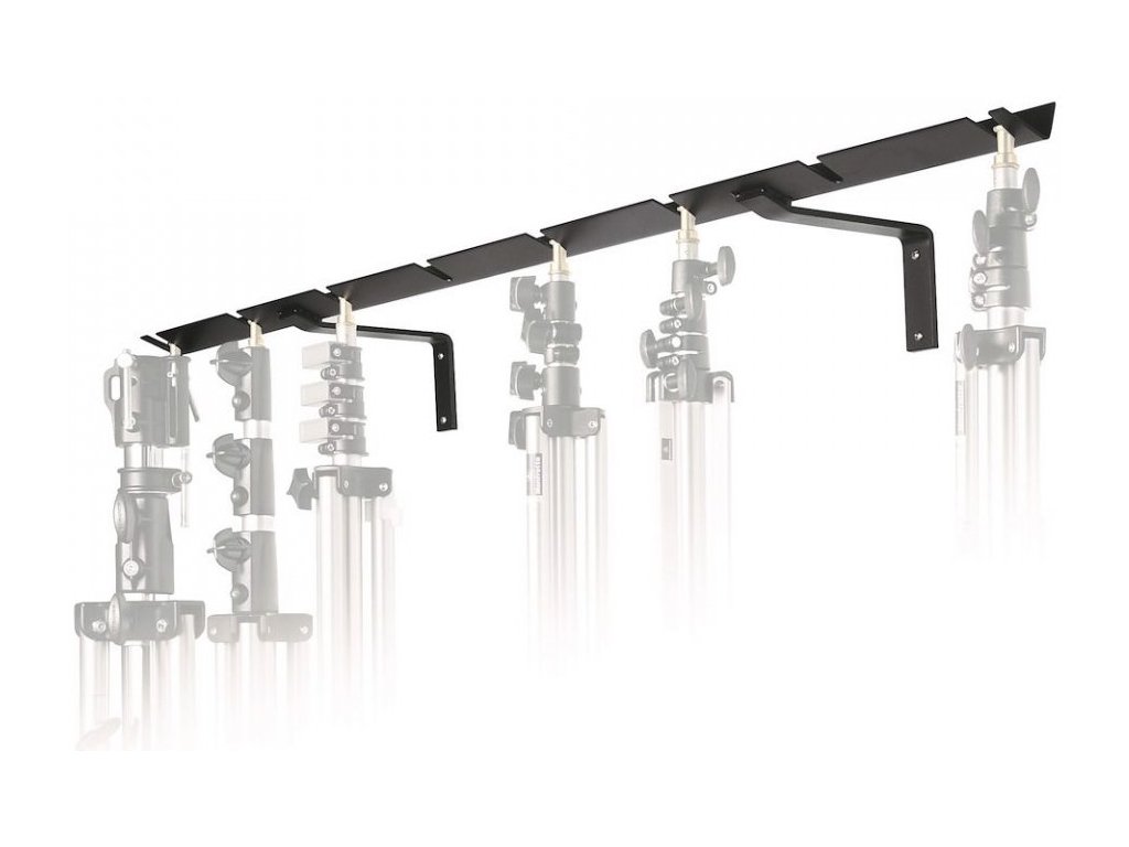Držiak na 8 svetelných stojanov, šírka 115 cm, vzdialenosť medzi upevňovacími otvormi 64,4 cm, hĺbka 19 cm.