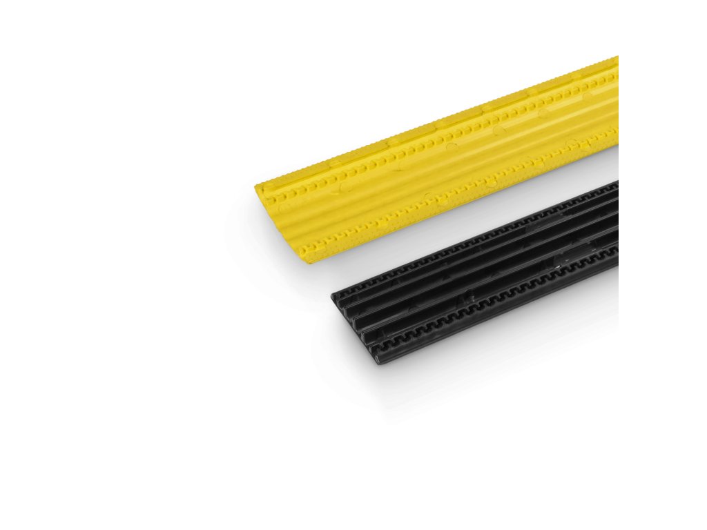 Systém ponúka flexibilné riešenie vďaka priamym, 90° a koncovým rampám. Možno ho ľahko upraviť na požadovanú dĺžku pomocou rezných vodidiel. Kľukaté pripojenie zaisťuje pevné spojenie jednotlivých dielov a otvory pre skrutky umožňujú spoľahlivé upevnenie do podlahy. Vďaka tomu nielenže efektívne organizuje káble, ale predovšetkým eliminuje riziko zakopnutia a zaisťuje bezpečný pohyb.