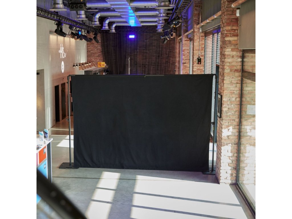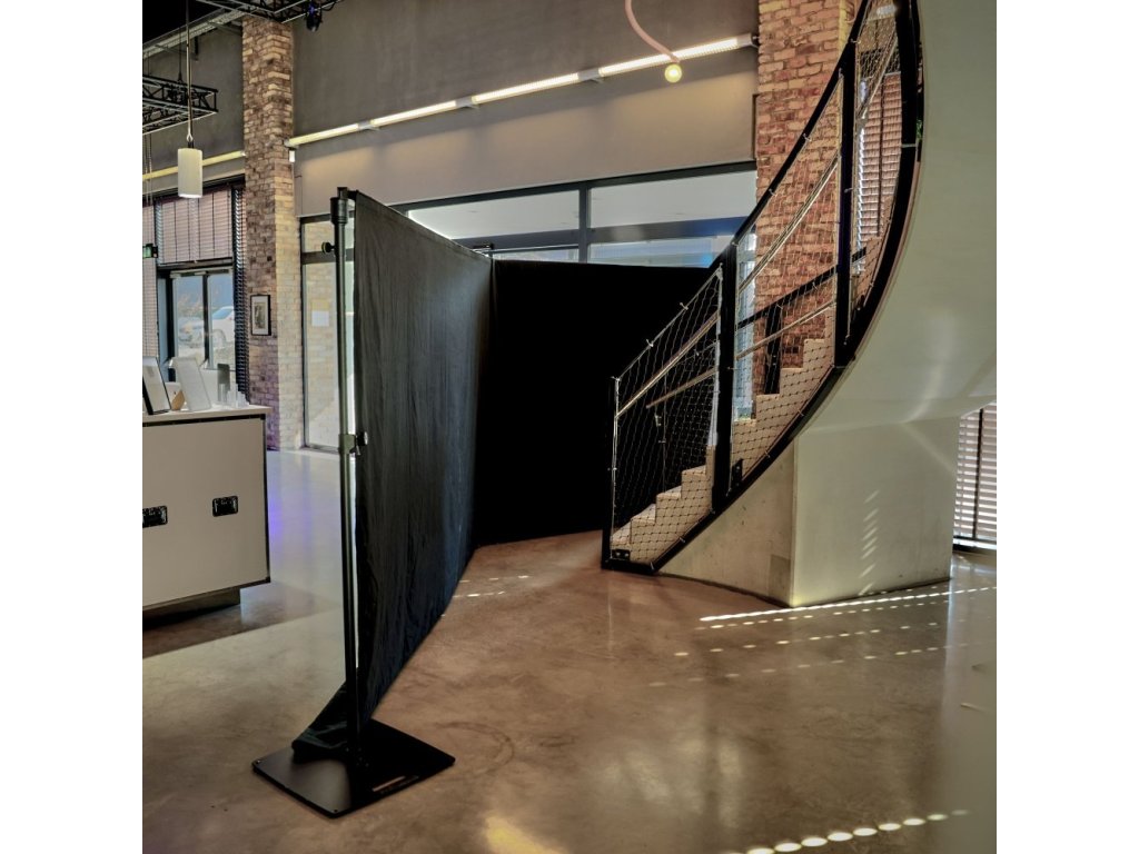 Teleskopická tyč PAD T, vyrobená z hliníka, sa predlžuje od 190 cm do 350 cm, čo umožňuje prispôsobiť šírku systému. Vďaka sklopným kĺbom na oboch koncoch uľahčuje tyč jednoduchú a prispôsobivú montáž bez nutnosti použitia rebríka alebo pomoci iných osôb. Čierny záves Molton PAD C B 1 má rozmery 3,50 m x 2,55 m a je vybavený praktickým pásikom na suchý zips pre jednoduché pripevnenie k tyči PAD T. Táto nehorľavá záclona, vyrobená z materiálu EURO molton, sa môže pochváliť nepriehľadnosťou 320 g/m² a celkovou hmotnosťou necelé 3 kg.