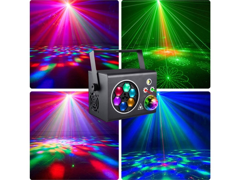 - Typ zariadenia: svetelný LED DMX multiefekt s montážnym držiakom- Zdroj svetla: efekt gobo: 6x3W R/G/B/W/P/Y LED, obojsmerná rotácia s nastaviteľnou rýchlosťou, efekt diskotékovej gule: 3x1W R/G/B LED, efekt červeného lasera: 100 mW, 650 nm, efekt zeleného lasera: 15 mW, 532 nm, efekt bieleho stroboskopu: 1x10W W LED