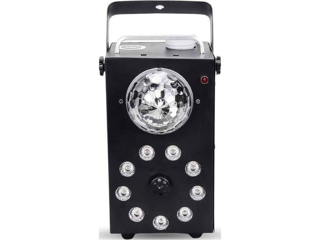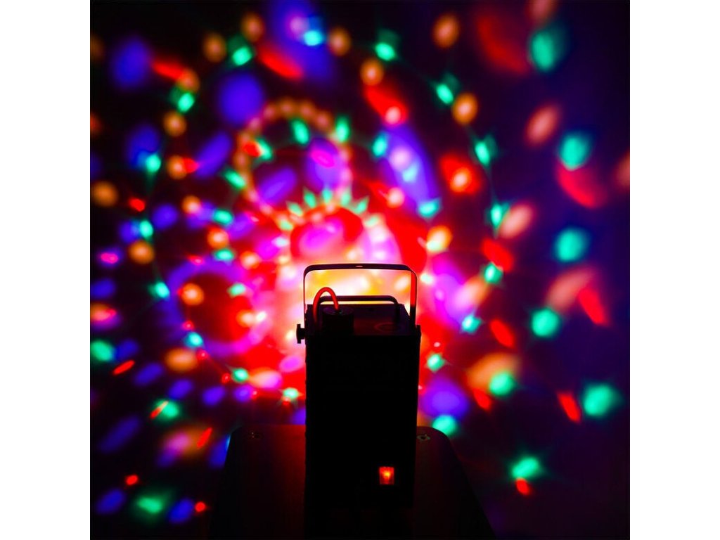 - Zdroj svetla: 9x1W RGB LED 3v1 (červená, zelená, modrá), disco guľa: 6x1W LED - červená, zelená, modrá, biela, jantárová, UV