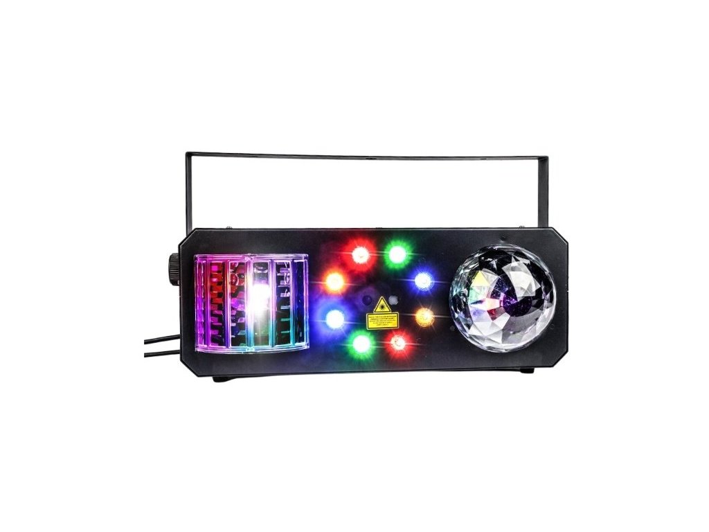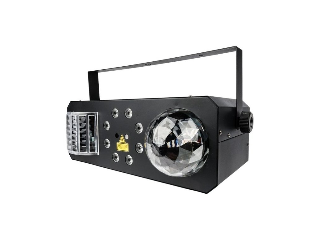 LIGHT4ME PARTY IV V2 je multifunkčné osvetľovacie zariadenie kombinujúce efekty derby, disko gule, wash a laser, ktoré využíva osem LED diód RGBY pre wash efekt, osem LED diód RGB pre disko guľu, šesť LED diód RGB po 3 wattoch pre derby efekt a dva lasery s výkonmi 120mW (červený) a 30mW (zelený). Zariadenie ponúka širokú škálu svetelných efektov, ktoré sú vhodné pre domáce večierky aj profesionálne akcie, a je vybavené štyrmi prevádzkovými režimami (auto, zvuk, master/slave, DMX) a stmievačom s plným rozsahom, ktorý umožňuje presné ovládanie jasu.