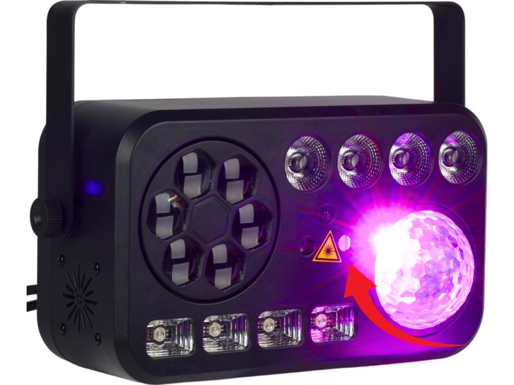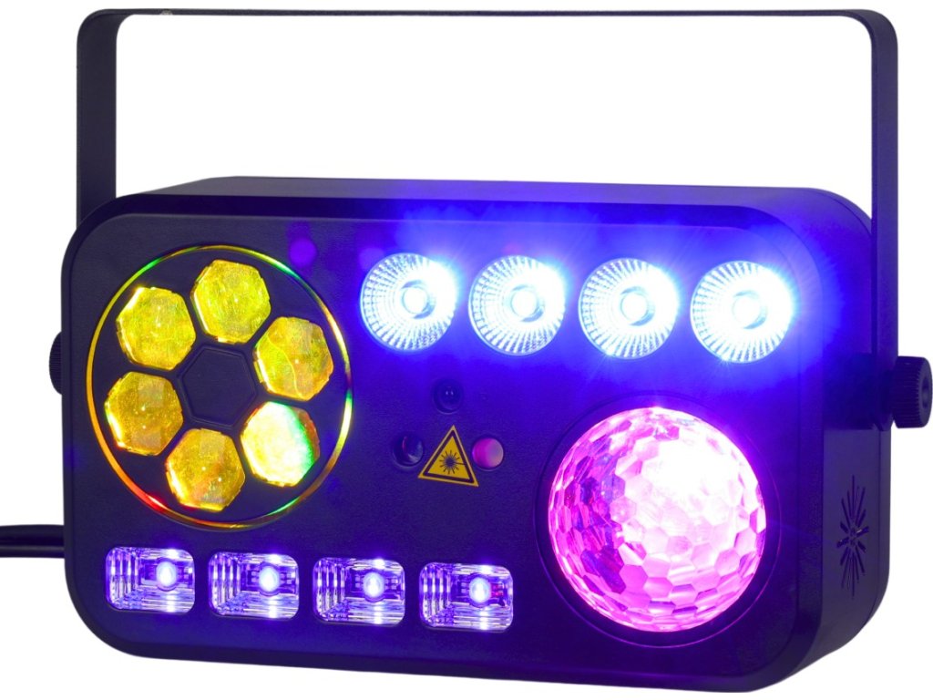 - Zdroj svetla: efekt Včelie oko: 6x8W RGBW LED 4v1, efekt bieleho stroboskopu/UV: 4x3W W+UV LED 2v1, efekt Vodná vlna: 10W RGBW LED 4v1, efekt PAR: 4x4W RGBW LED 4v1, laser červený: 120 mW, laser zelený: 30 mW