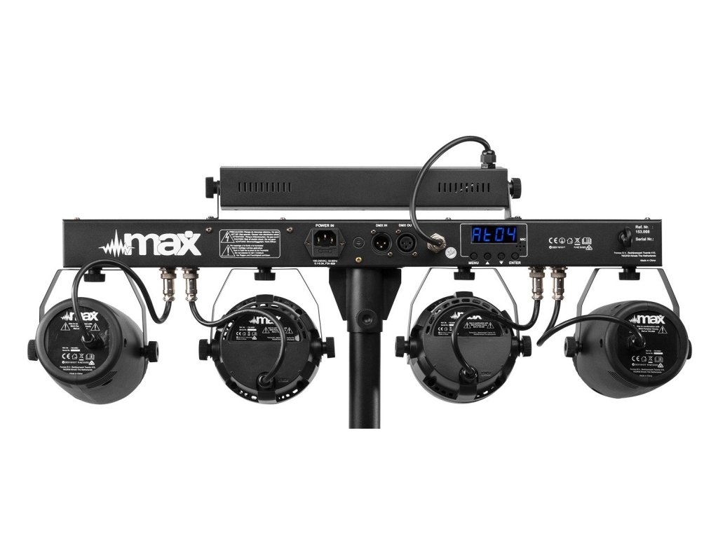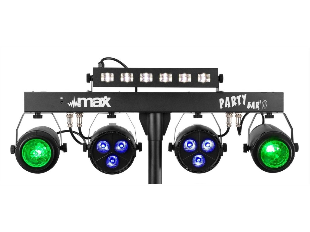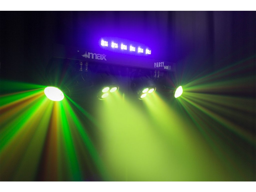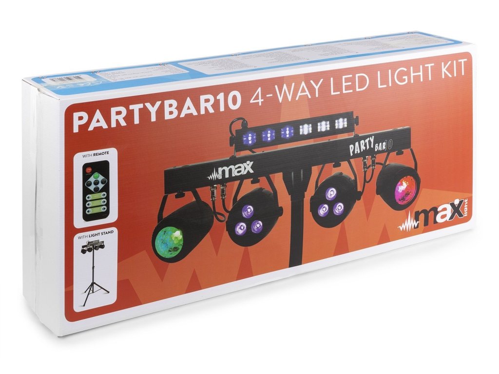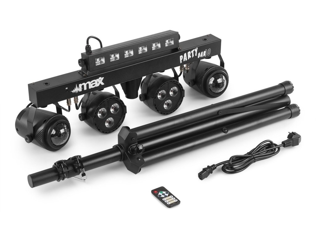Rad MAX PartyBar sa skladá z rady kompletných sád vybavených veľkolepými svetelnými LED efektmi. Všetky sady sú vybavené vysoko intenzívnymi LED v rôznych farbách. Tento model PartyBaru je typu plug and play a možno ho ovládať pomocou DMX, IR diaľkového ovládania, automaticky, alebo pomocou zvukom aktivovaných programov. Na zadnej strane je LED displej s tlačidlami pre jednoduchý výber ovládania. Súčasťou balenia je aj statívový stojan pre rýchle a jednoduché nastavenie. Vhodné pre všetky typy pódií, večierky, umelcov aj ďalšie špeciálne akcie.