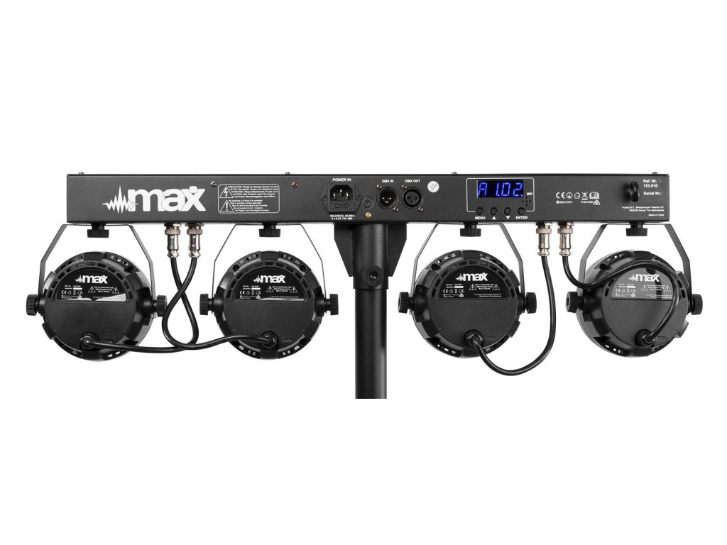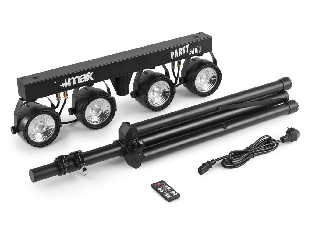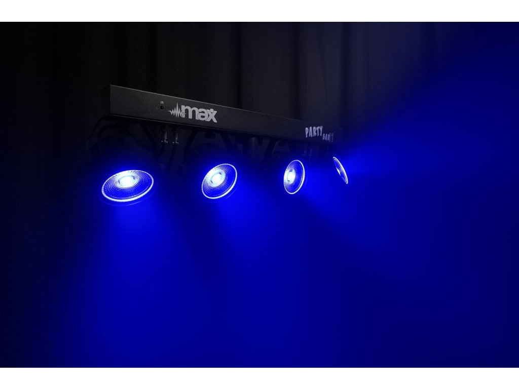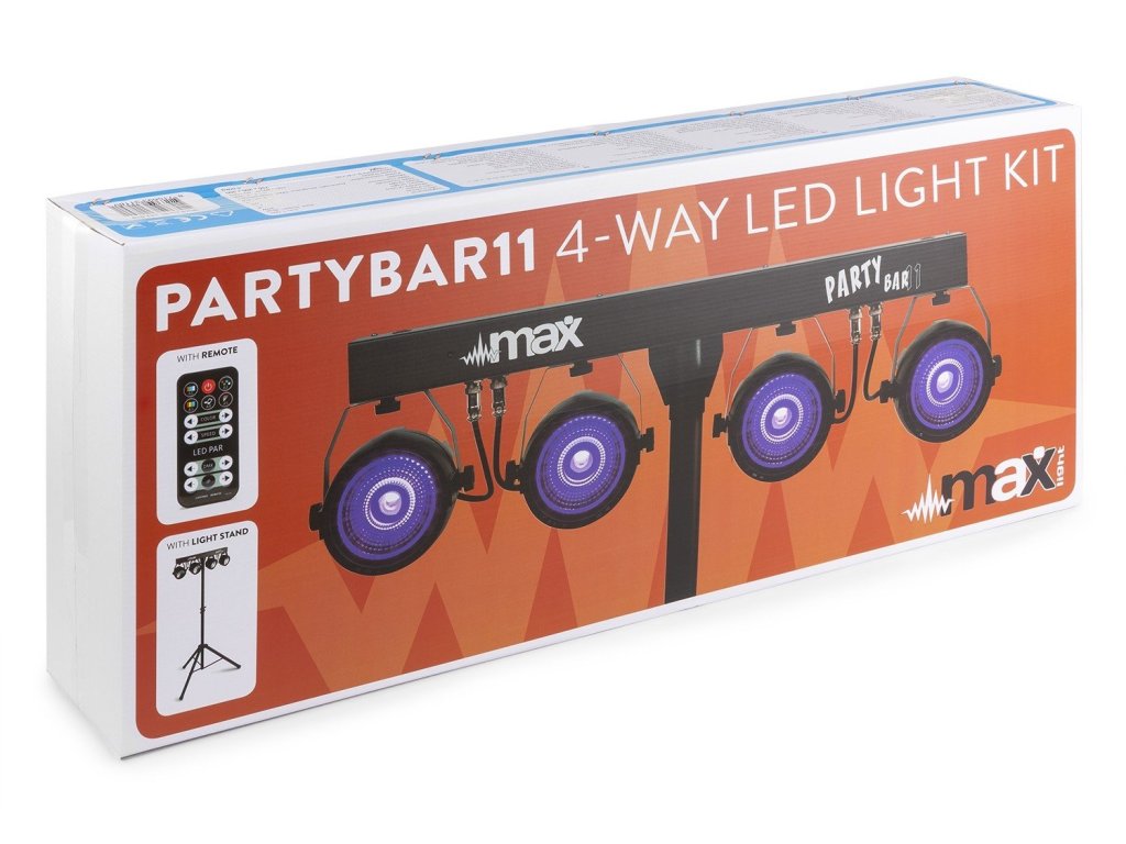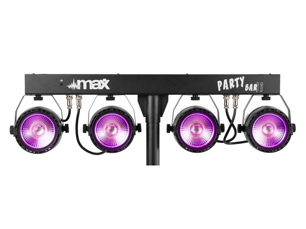 Rad MAX PartyBar sa skladá z rady kompletných sád vybavených veľkolepými svetelnými LED efektmi. Všetky sady sú vybavené vysoko intenzívnymi LED v rôznych farbách. Tento model PartyBaru je typu plug and play a možno ho ovládať pomocou DMX, IR diaľkového ovládania, automaticky, alebo pomocou zvukom aktivovaných programov. Na zadnej strane je LED displej s tlačidlami pre jednoduchý výber ovládania. Súčasťou balenia je aj statívový stojan pre rýchle a jednoduché nastavenie. Vhodné pre všetky typy pódií, večierky, umelcov aj ďalšie špeciálne akcie.
