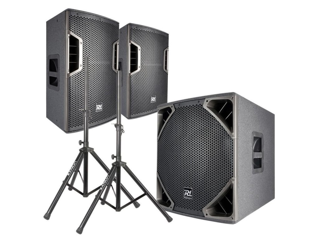 Výhodný set 2 aktívnych reproboxov Power Dynamics PD612A 12" 800W a aktívneho subwoofera Power Dynamics PD615SA 15" 1000W so stojanmi a prepojovacími káblami.