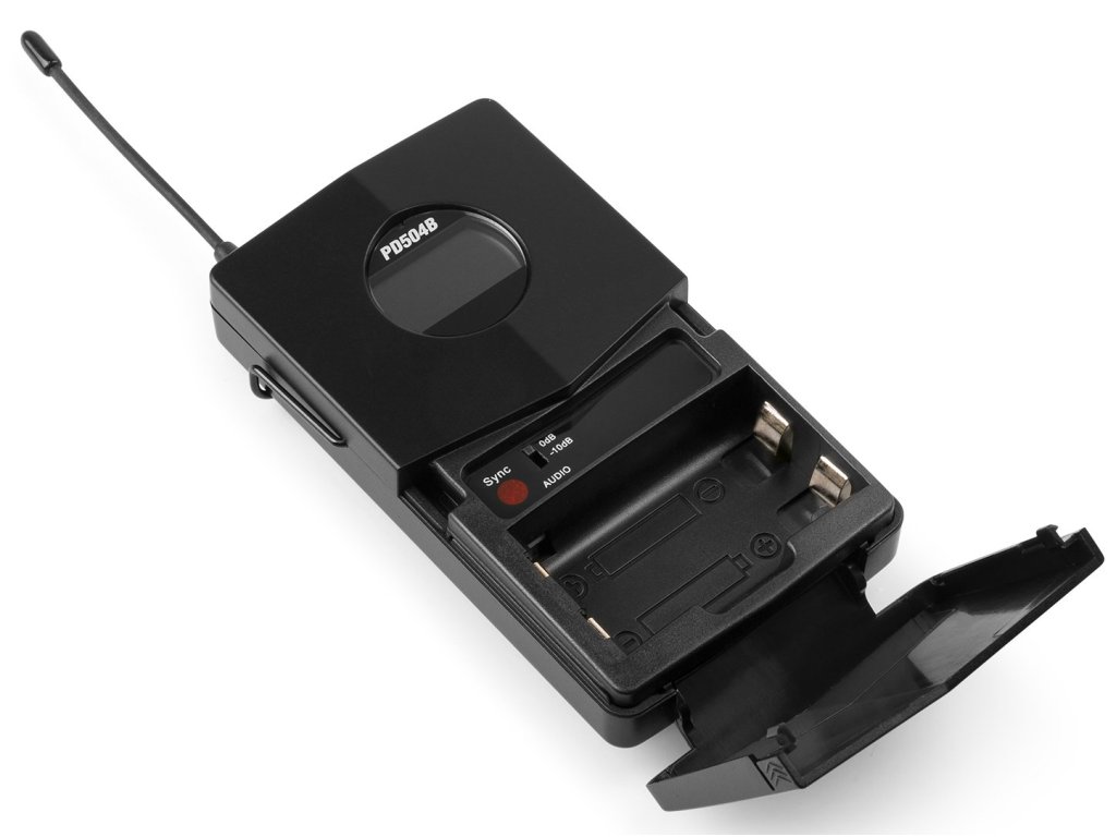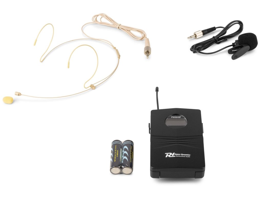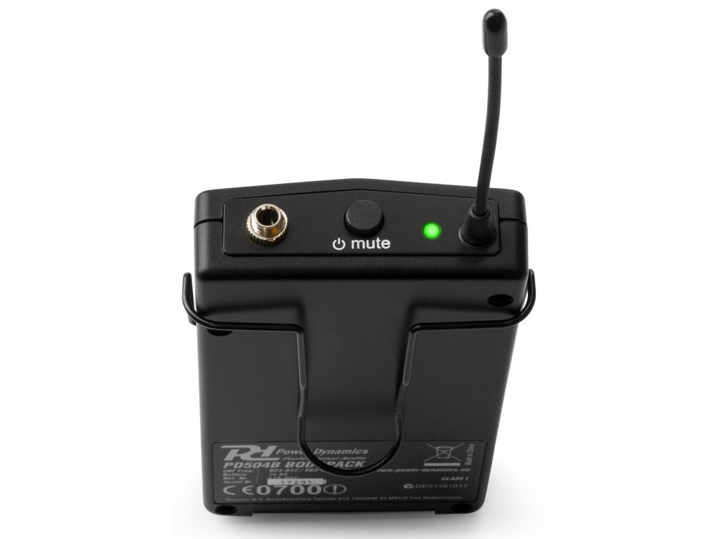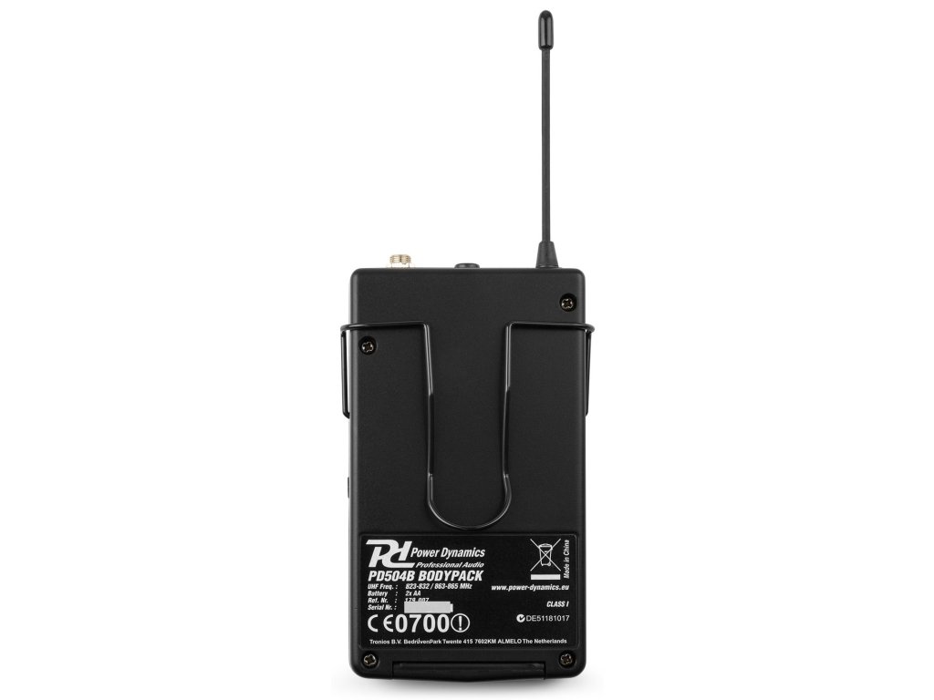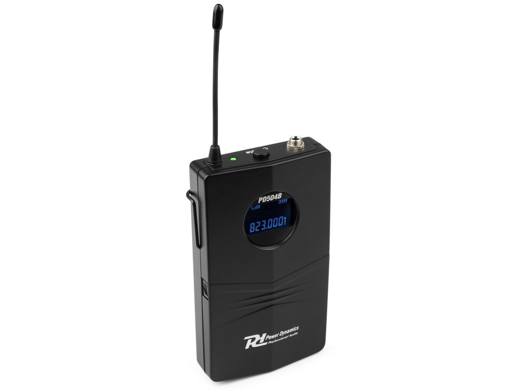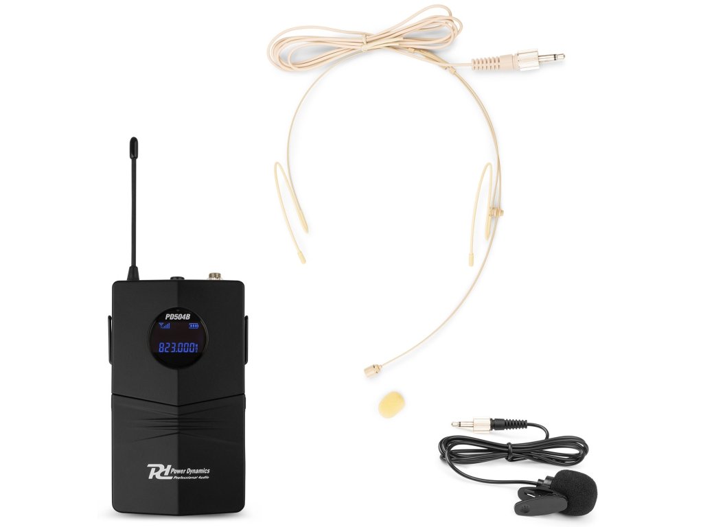 Bodypack vysielač pre bezdrôtové UHF mikrofónne systémy série PD504. Vybavené IR učiacim systémom pre výber kanála. Ideálne pre handsfree aplikácie, vokály, prezentácie atď. Sada obsahuje klopový mikrofón a náhlavný mikrofón v telovej farbe.