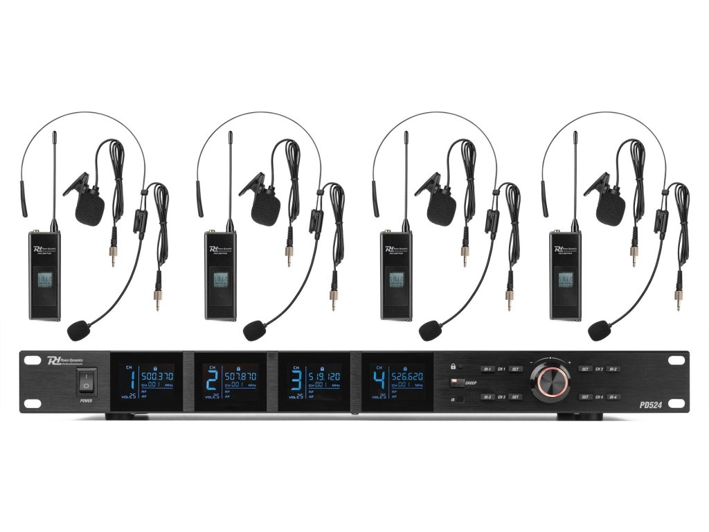 PD524 je profesionálny bezdrôtový mikrofónny systém vybavený 4x 100 kanálmi a je určený pre väčšie vystúpenia alebo akcie. Prijímač s prehľadným dynamickým LCD displejom zaisťuje prenos bez rušenia, spolu s kvalitným squelchom a PLL syntetizátorom. Mikrofónny systém PD524 pracuje v pásme 500-530 MHz a je vhodný pre vokály, prezentácie, školenia a ďalšie PA-aplikácie. Táto sada sa dodáva so 4-kanálovým prijímačom UHF, štyrmi bodypack vysielačmi s dobíjacou li-ion batériou, 4 náhlavnými súpravami v čiernej farbe, 4 klopovými mikrofónmi, 2 odnímateľnými anténami BNC, 2 predlžovacími káblami pre prednú montáž antén, napájacím adaptérom a kufríkom ABS. Súčasťou balenia sú tiež 4 káble USB pre nabíjanie bodypack vysielačov.