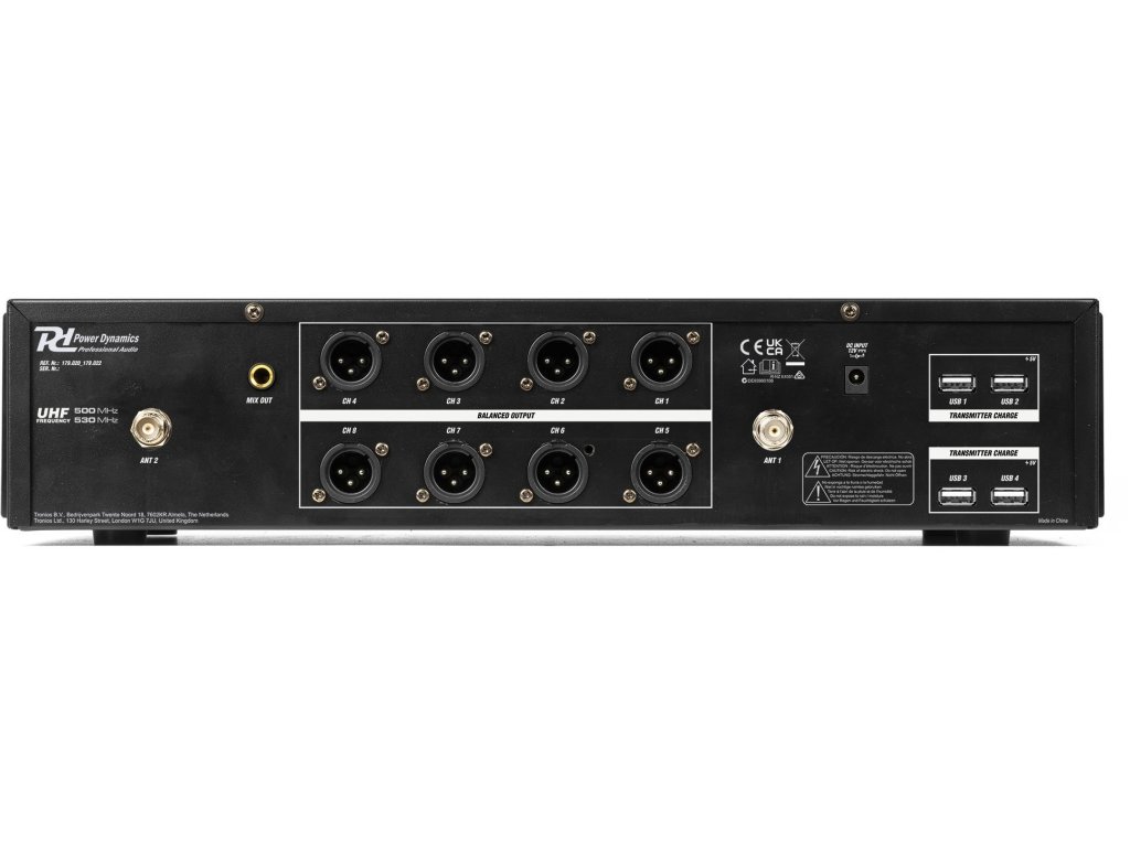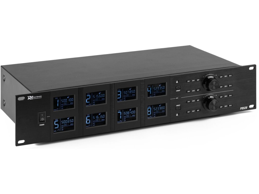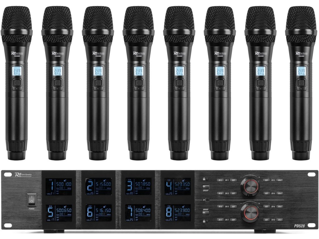 PD528 je profesionálny bezdrôtový mikrofónny systém vybavený 8x 100 kanálmi a je určený pre väčšie vystúpenia alebo akcie. Prijímač s prehľadným dynamickým LCD displejom zaisťuje prenos bez rušenia, spolu s kvalitným squelchom a PLL syntetizátorom. Mikrofónny systém PD528 pracuje v pásme 500-530 MHz a je vhodný pre vokály, prezentácie, školenia a ďalšie PA-aplikácie. Táto súprava sa dodáva s 8-kanálovým prijímačom UHF, 8 ručnými mikrofónmi s dobíjacou li-ion batériou, 2 odnímateľnými anténami BNC, 2 predlžovacími káblami pre prednú montáž antén, napájacím adaptérom a kufrom ABS. Súčasťou balenia je aj 8 káblov USB pre nabíjanie bezdrôtových mikrofónov.