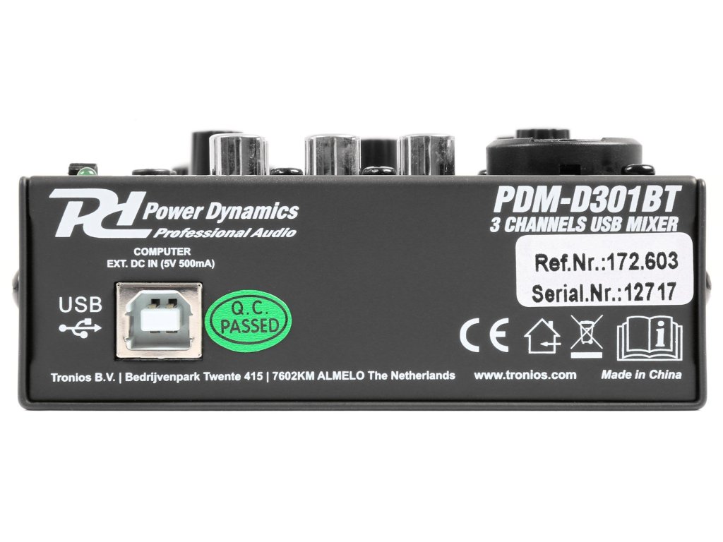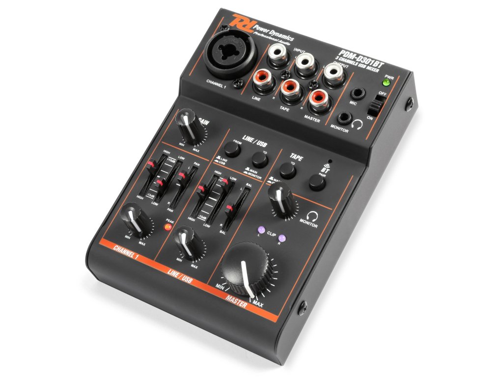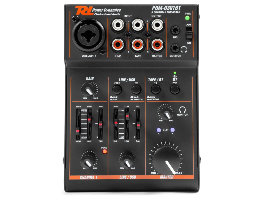 Tento 3-kanálový mixážny pult PDM-D301 s USB zvukovou kartou je jedinečný, pretože jeho funkcie nemožno nájsť na žiadnom inom zariadení tejto veľkosti. BT-prijímač v mixážnom pulte poskytuje tomuto zariadeniu bezdrôtový prenos zvuku. Pult obsahuje 1 mono a 1 stereo vstupný kanál s 2-pásmovým ekvalizérom pre ovládanie High / Low úrovní. Vstavaná zvuková karta USB slúži aj ako zdroj napájania.