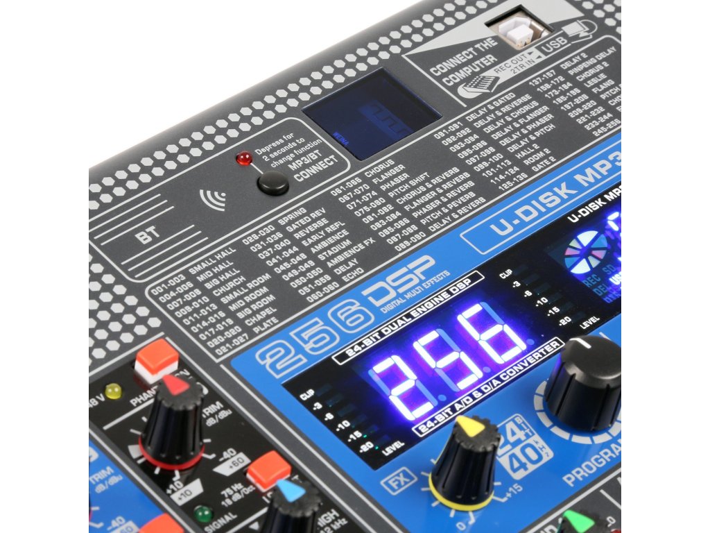20-kanálový profesionálny duálny mixážny pult, rozdelený do 10 kanálov na každej strane. Ideálny na použitie pri živých vystúpeniach, bohoslužbách alebo na iných miestach, kde sa využíva viac vstupov.