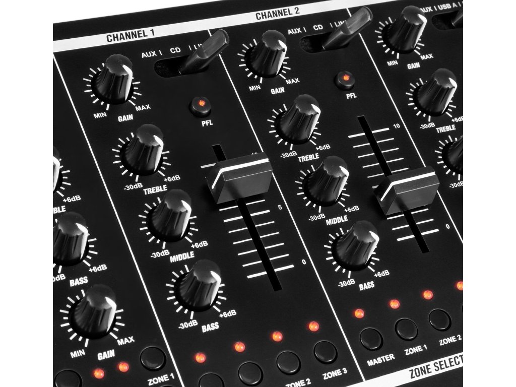 PDZM700 je 6-kanálový DJ mixážny pult so 4 zónami. Trojpásmový ekvalizér na každom kanáli zaisťuje príjemný zvuk. Ktorýkoľvek zo 6 kanálov môže byť voľne smerovaný na ktorýkoľvek zo 4 výstupov stereo zóny. Oddelený mikrofónový kanál s ekvalizérom je ideálny pre prezentácie alebo karaoke. PDZM700 je vhodný pre bary, kluby, reštaurácie atď.