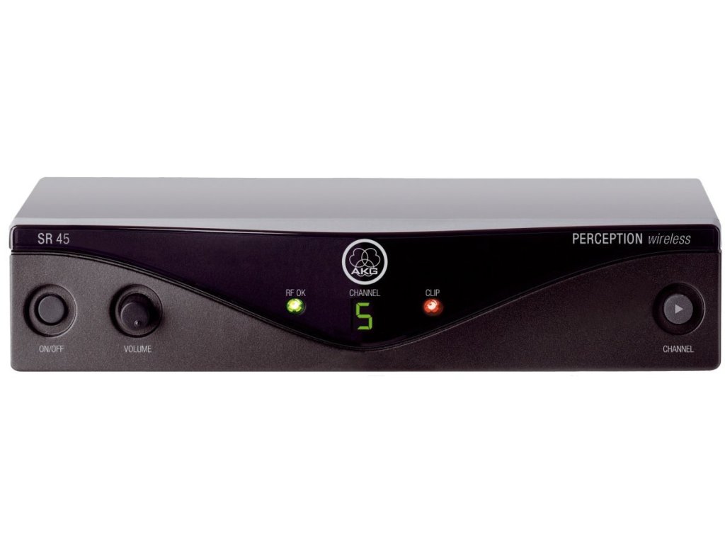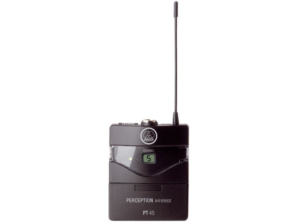 Súčasťou setu AKG Perception WMS45 Wireless Sports Set je prijímač AKG SR45, bodypack AKG PT45 a hlavový mikrofón AKG C544 L. Prijímač má na svojom šasi minimum ovládacích prvkov, napriek tomu nie je nastavovanie parametrov nijako ochudobnené. Na ovládanie slúži potenciometer Volume, tlačidlo Channel na prepínanie kanálov, LED displej zobrazujúci zvolený kanál, LED indikátory signálu a clippingu, vypínač a trimr na nastavenie squelche. Výstupy sú osadené XLR a ¼“ Jack konektormi. BodypackPT45 je vôbec najmenším a najľahším vysielačom vo svojej triede a okrem toho je kompatibilný s miniatúrnymi mikrofónmi AKG MicroMics, ktoré umožňujú kvalitné ozvučenie všetkých bežných nástrojov. PT45 je vybavený displejom, LED indikátorom stavu batérie a vypínačom, pod krytkou batérie nájdeme prepínač kanálov a trimr na nastavenie vstupnej úrovne. Bodypack je napájaný jednou AA batériou, na ktorej dosahuje životnosť až 10 hodín. Priložený kondenzátorový hlavový mikrofón vychádza z modelu C555 L a disponuje štvorvrstvovou ochranou, ktorá ho chráni pred potom. Ergonomický tvar zaručuje pohodlné nosenie, špeciálna konštrukcia zase vysokú odolnosť proti mechanickým ruchom, ktoré pri športe vznikajú.