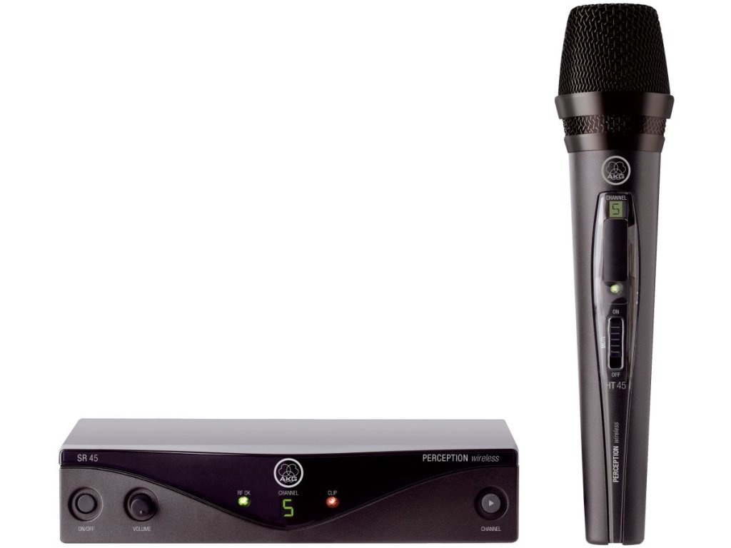 Súčasťou setu AKG Perception Wireless Vocal Set je prijímač AKG SR45 a mikrofón do ruky AKG HT45. Prijímač má na svojom šasi minimum ovládacích prvkov, napriek tomu nie je nastavovanie parametrov nijako ochudobnené. Na ovládanie slúži potenciometer Volume, tlačidlo Channel na prepínanie kanálov, LED displej zobrazujúci zvolený kanál, LED indikátory signálu a clippingu, vypínač a trimr na nastavenie squelche. Výstupy sú osadené XLR a ¼“ Jack konektormi. Mikrofón obsahuje dynamickú mikrofónovú vložku s kardioidnou smerovou charakteristikou. Vyznačuje sa vysokou odolnosťou proti mechanickým ruchom aj spätnej väzbe. Na tele mikrofónu je displej zobrazujúci zvolený kanál a tlačidlo na prepínanie kanálov, prepínač citlivosti mikrofónu, LED indikátor stavu batérie a vypínač. AKG HT45 je napájaný jednou AA batériou, na ktorej dosahuje životnosť až 10 hodín.