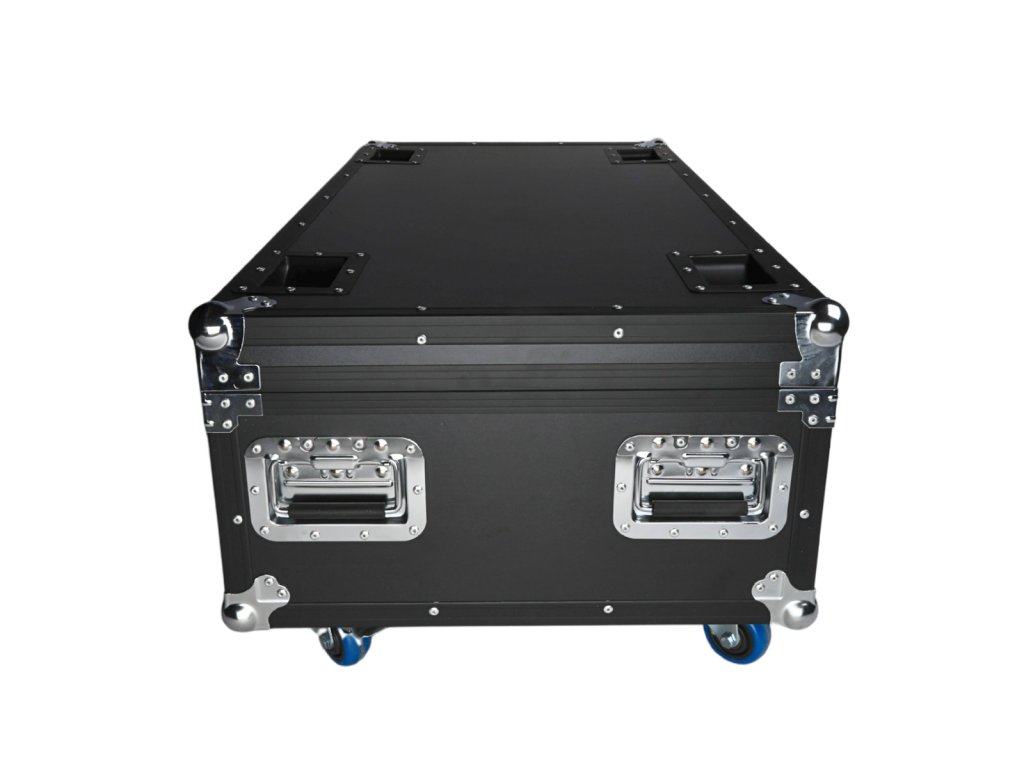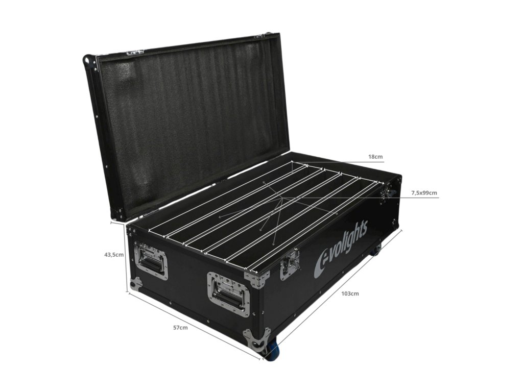 Evolights predstavuje kvalitu, pohodlie pri používaní a konkurencieschopnú cenu. To isté platí pre tento prepravný kufor Pixel Bar 18x10W RGBW kufor 6in1. Jeho veko chráni pred nechceným otvorením dve robustné motýlikové zámky. Veko sa otvára jednostranne do zvislej polohy a vďaka vhodnému uhlu sklonu nepadá na používateľa, čo zaisťuje ľahký a pohodlný prístup k uloženým zariadeniam. Vnútri sa nachádza šesť priehradok dokonale prispôsobených svetelným lištám. Vnútro puzdra je vyplnené mäkkou technickou penou, ktorá dokonale chráni uloženú techniku pred poškodením. Na každej strane kufra sú dve pohodlné rukoväte uľahčujúce prenášanie a na spodnej strane štyri otočné kolieska, z toho dve s brzdou.
