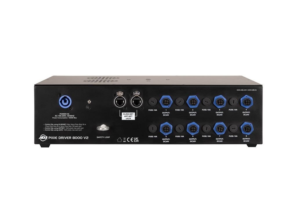 Pixie Driver 8000 V2 je navrhnutý špeciálne pre ADJ Pixie Strip 30, Pixie Strip 60 a Pixie Strip 120. Poskytuje jednoduché a univerzálne možnosti ovládania, vrátane jednoduchého manuálneho nastavenia stmievania a strobe efektu, plus plnú kontrolu pixel mappingu až 8ks 160 pixelov prostredníctvom protokolov Kling-Net, Art-Net alebo sACN (streaming ACN). Pixie Driver 8000 V2 obsahuje univerzálny automaticky prepínateľný napájací zdroj (100-240 V), LCD ovládací displej so 4 tlačidlami, RJ45 ethernetové porty pre vstup a výstup, (8) výstupov pre Pixie Strip, ktoré používajú proprietárne 4-pinové kombinované káble (predávajú sa samostatne) prenášajúce napájanie a dáta ku každému pruhu pixie (k dispozícii v dĺžkach od 2 do 50 stôp, podrobnosti viď Doplnky predávané samostatne v sekcii Špecifikácie). Pixie Driver 8000 je možné namontovať do štandardného 19-palcového racku (rackové uši sú súčasťou balenia) alebo pripevniť na truss pomocou svorky (nie je súčasťou balenia).