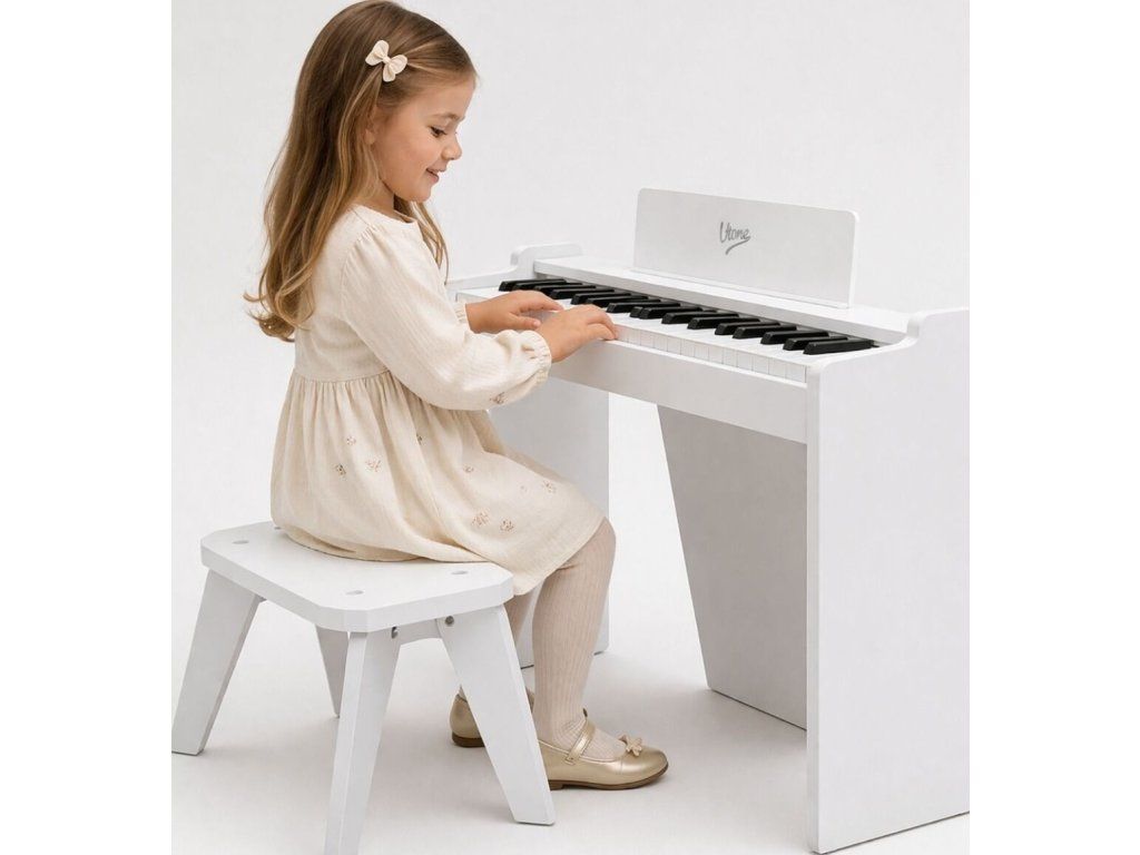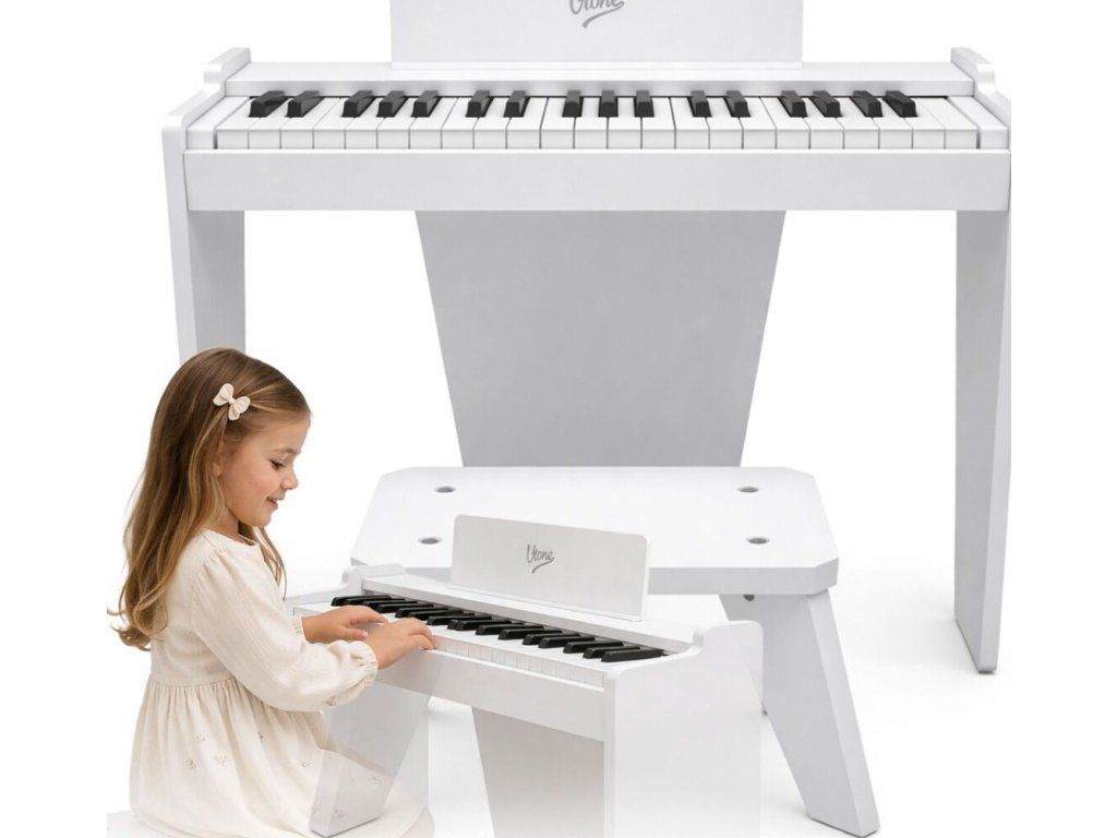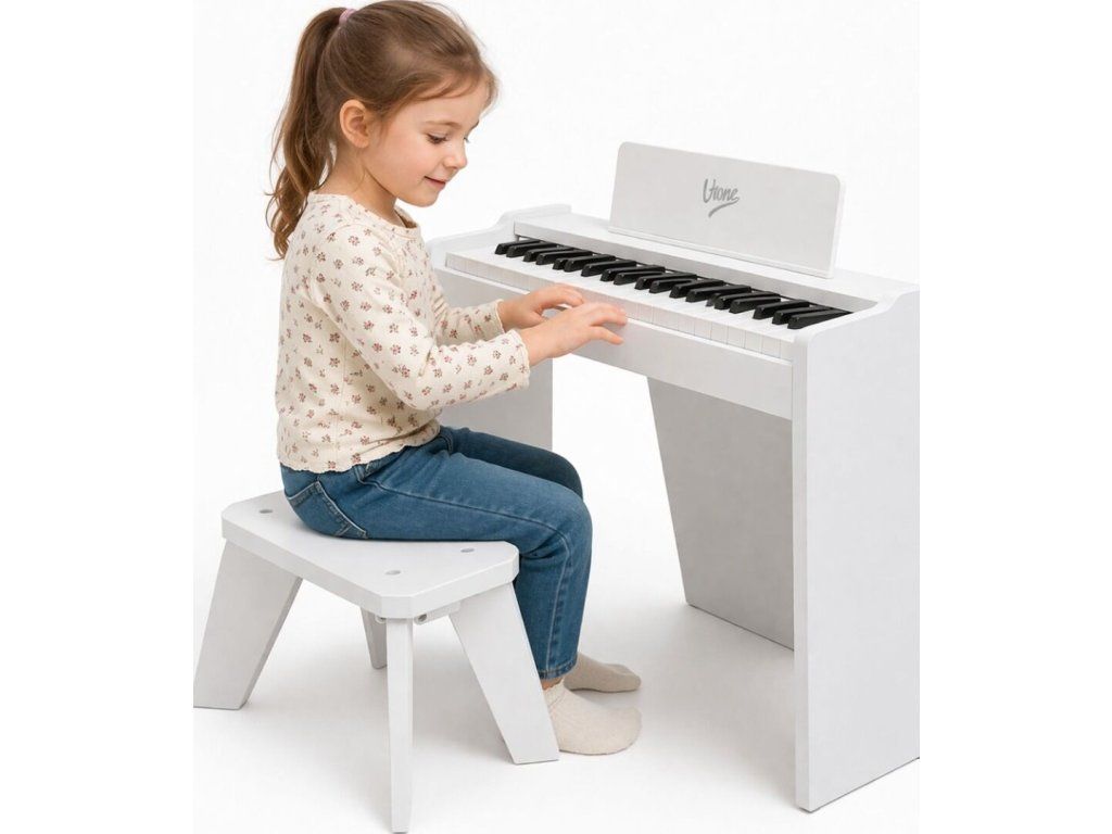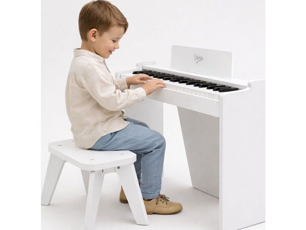 V-TONE PJR 50 WH je digitálne elektronické piano pre deti vo forme mini koncertného krídla, vytvorené s ohľadom na najmenších, ktorí chcú začať hrať priateľským a atraktívnym spôsobom. Skvele sa hodí do detskej izby, herne, škôlky, hudobného kútika a na každodenné cvičenie doma. Už od prvých chvíľ nabáda k usadnutiu ku klaviatúre, pretože má 37 kláves, vstavaný reproduktor a kompaktnú voľne stojacu formu, ktorá vyzerá ako malý klavír. Počas popoludňajšej zábavy si dieťa môže sadnúť na priloženú stoličku, nalepiť označenie na klávesy a rýchlo nájsť prvé tóny bez zložitej prípravy. Je to skvelá voľba pre rodičov, ktorí hľadajú nástroj pre začiatočníkov, estetický, ľahký na vnímanie a prispôsobený detskému priestoru.