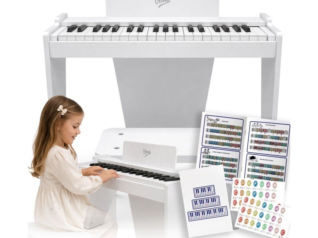 Tento model pomáha začať učenie bez zastrašenia veľkým nástrojom a bez zložitej konfigurácie. Vzdelávacie nálepky na klávesy uľahčujú orientáciu na klaviatúre, takže si dieťa rýchlejšie spojí umiestnenie zvukov. Priložená stolička ihneď vytvára hotovú súpravu na hranie a konštrukcia z MDF dosky a ABS plastu dobre zapadá do každodenného používania doma.