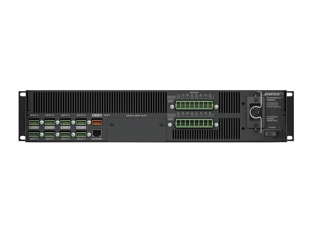 Konfigurovateľný profesionálny výkonový zosilňovač Bose Professional PowerMatch PM8500N poskytuje zvuk koncertnej kvality s vysokou úrovňou škálovateľnosti a konfigurovateľnosti pre pevne inštalované systémy ozvučenia. Sieťové pripojenie na báze Ethernetu umožňuje konfiguráciu, ovládanie a monitorovanie a rozširujúci slot podporuje vstup z voliteľných kariet digitálneho zvukového príslušenstva. Pripojenie USB na prednom paneli umožňuje priame pripojenie konfiguračného počítača k jednému zosilňovaču. Zosilňovače PowerMatch využívajú množstvo technológií Bose Professional a poskytujú bezprecedentnú kombináciu výkonu, účinnosti a jednoduchej inštalácie – to všetko v spoľahlivom, patentovanom prevedení.