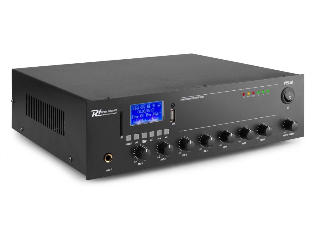 Zosilňovač PPA30 100V patrí do rady zosilňovačov s výstupmi 8 Ohms, 70V a 100V, ktoré sa vyznačujú jednoduchým použitím, vynikajúcim výkonom a spoľahlivosťou. Zvlášť vhodné pre širokú škálu malých a stredných inštalácií. Tento rad zosilňovačov je vybavený multimediálnym prehrávačom (USB / SD porty a BT) na prehrávanie MP3. Je tiež vybavený ekvalizérom (na mp3 prehrávači), 2 mikrofónnymi vstupmi, pomocným vstupom a externým 12V konektorom.