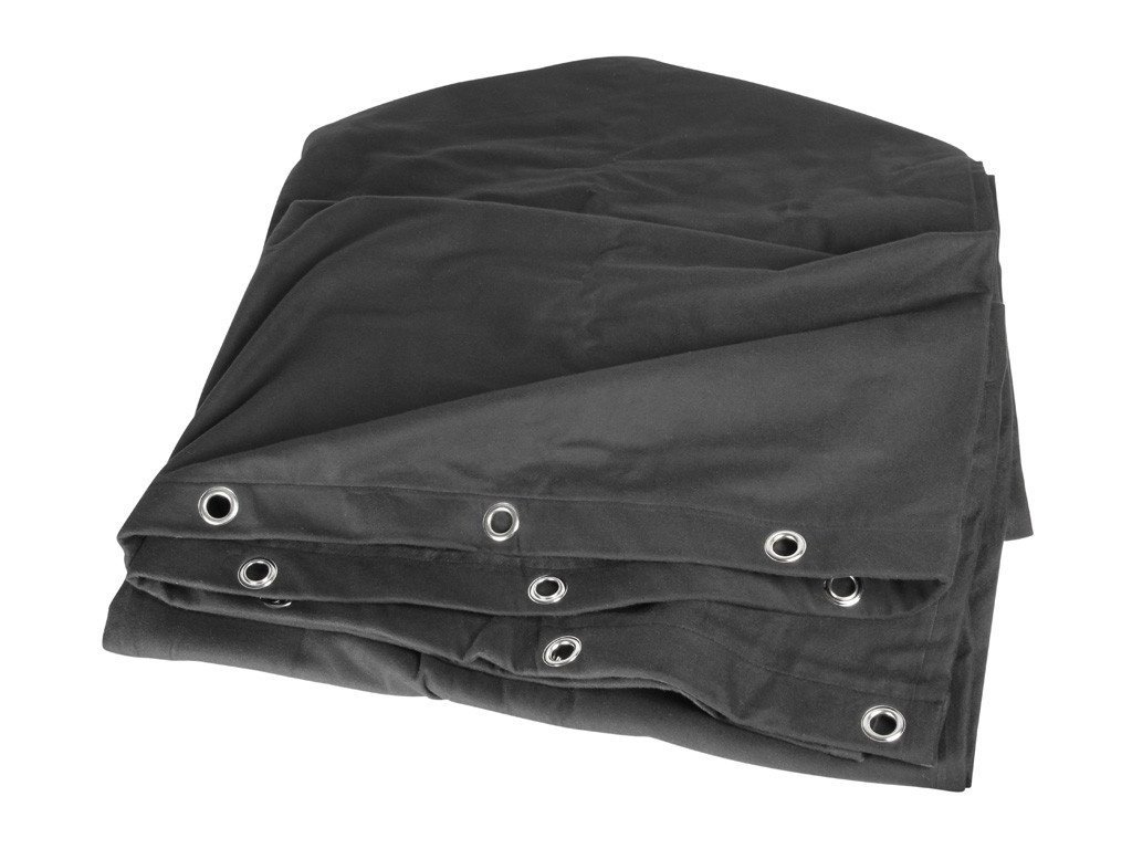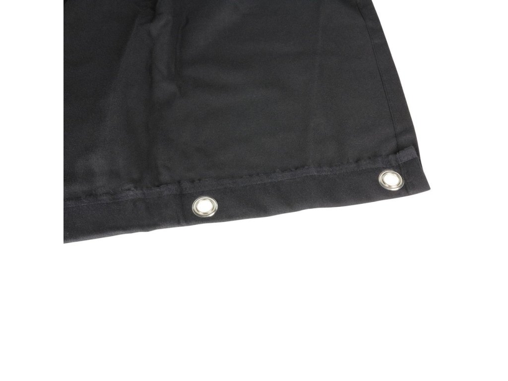 Nepriedušná čierna zatemňovacia tkanina s impregnáciou spomaľujúcou horenie (B1 podľa DIN 4102) a kvalitou 300 g, ako záves, pozadie alebo na dekoratívne účely. Tkaniny majú po jednej strane v rozstupoch 25 cm priechodky a sú podložené ďalším pruhom popruhu, čo umožňuje rýchlu a bezpečnú inštaláciu, ako pevne napnuté, tak voľne skladané. Priechodky sú nehrdzavejúce, leštené a majú priemer otvoru 12 milimetrov. Vonkajšie okraje sú olemované, zatiaľ čo spodný okraj je bez olemovania, takže materiál sa dá ľahko a rýchlo skrátiť na potrebnú dĺžku. Očká sú na širšej strane.