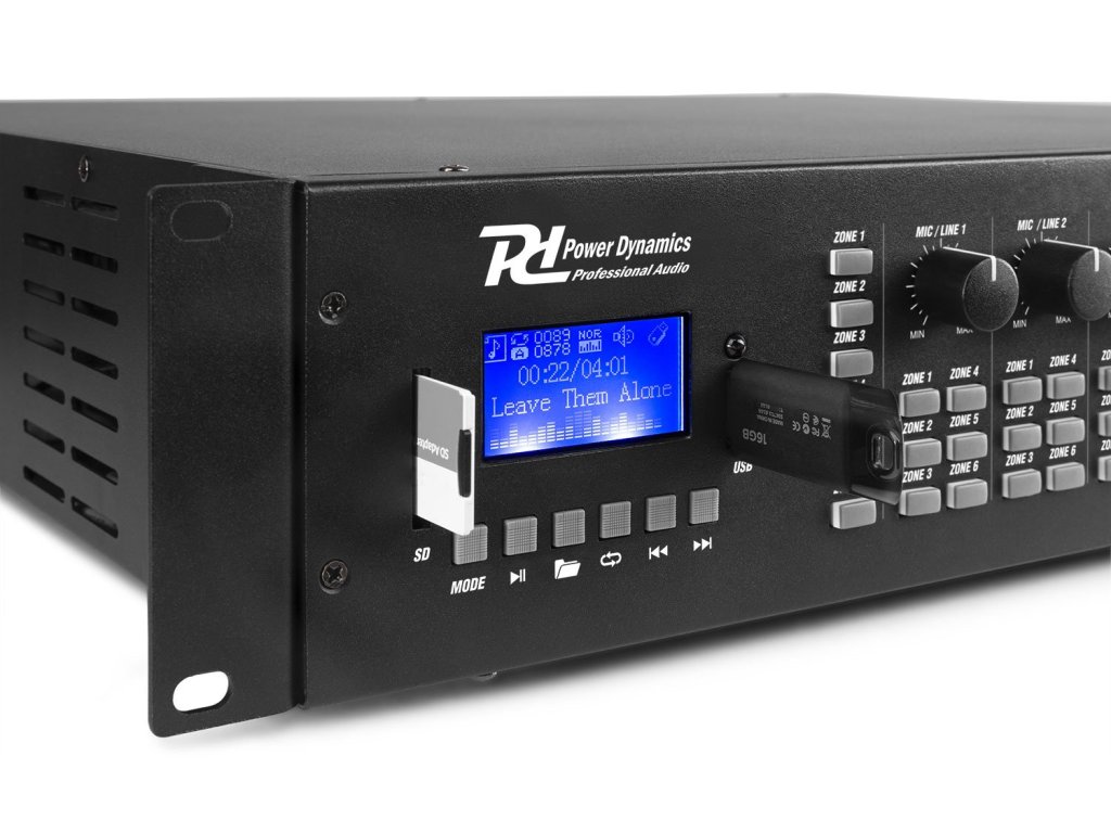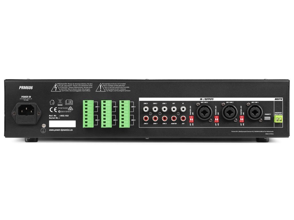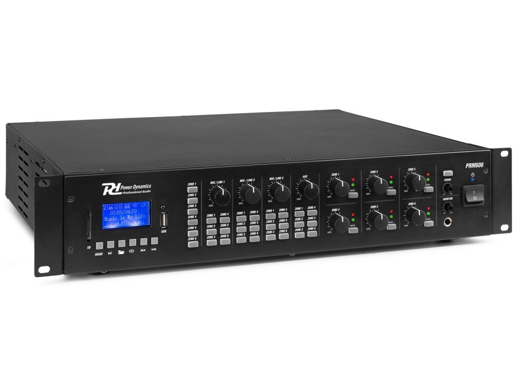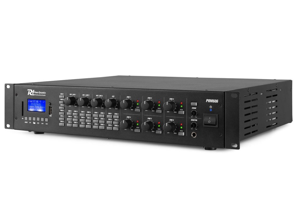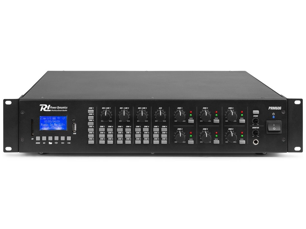 PRM606 je zosilňovač, ktorý je možné použiť buď ako 100V zosilňovač, alebo ako štandardný nízkoimpedančný zosilňovač. Tento 6-zónový zosilňovač je určený pre systémy multi-room vyžadujúce rôzne zdroje zvuku. Je vybavený prijímačom BT a portami USB / SD pre prehrávanie MP3, vrátane jasného LCD displeja s tagom ID3. PRM606 je vybavený prepínateľnými XLR vstupmi s 24V Phantom napätím, najmä pre kondenzátorové mikrofóny.
