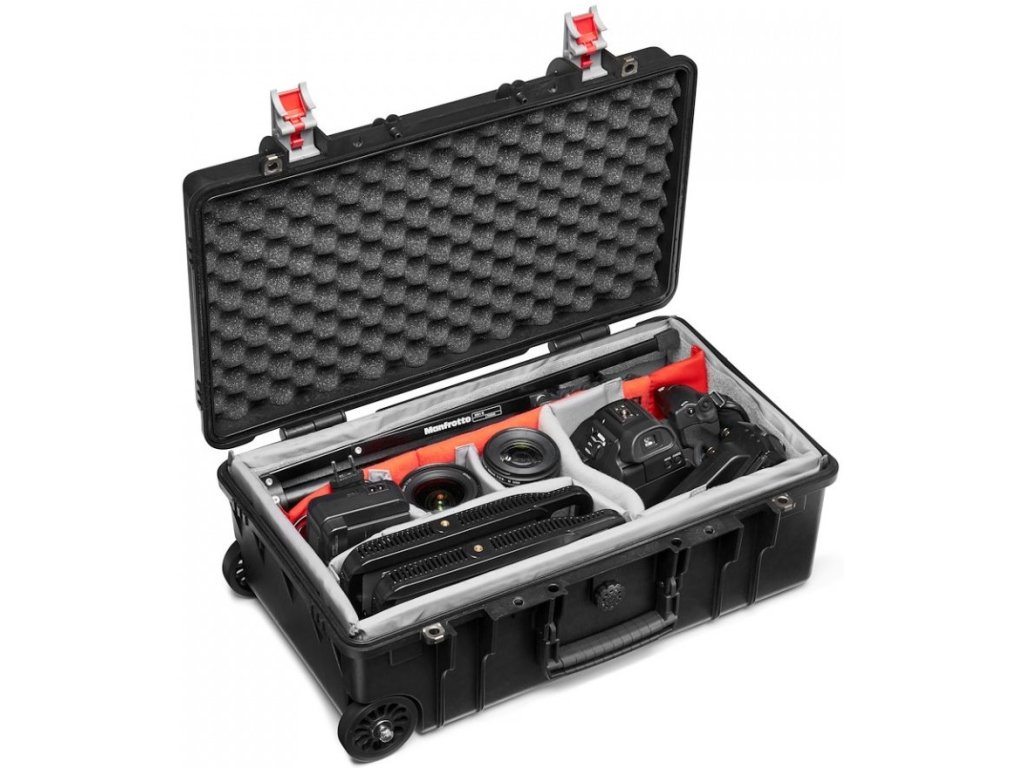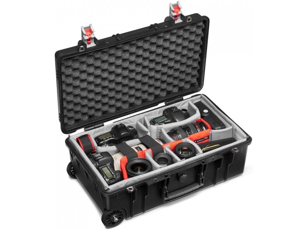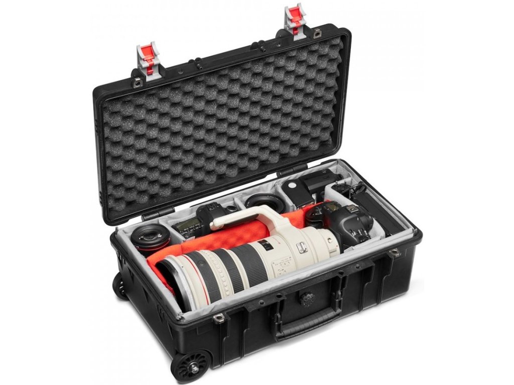 Nový Pro Light Reloader Tough H-55 pre DSLR a prémiové CSC je určený pre profesionálnych fotografov a kameramanov. Je vyrobený podľa najvyšších štandardov v Taliansku z vysoko kvalitných materiálov s originálnym štýlom Manfrotto. Vyrobené a navrhnuté fotografmi na cestách, ktorí nechcú robiť kompromis medzi bezpečnosťou a prenosnosťou. Navyše spĺňa rozmery kabínovej batožiny, ktoré zodpovedajú požiadavkám väčšiny leteckých spoločností a je vybavené 2-stupňovým zaťahovacím trolejovým systémom. Nový Pro Light Reloader Tough H-55 má vnútornú vyberateľnú organizačnú jednotku fotoaparátu, ktorú je možné prispôsobiť pomocou nastaviteľných prepínačov Manfrotto CPS. Zvládne pojať DSLR s pripojeným objektívom 400 / f2.8, druhým telom fotoaparátu a 3-4 ďalšími objektívmi (v závislosti od veľkosti). Schválené testovanie IP67: žiadne prenikanie prachu a zvládne dočasné ponorenie do vody po dobu až 30 minút. Pred odletom si vždy overte u leteckej spoločnosti svoje aktuálne požiadavky. Uvedomte si, že preťaženie kufra spôsobí jeho roztiahnutie.