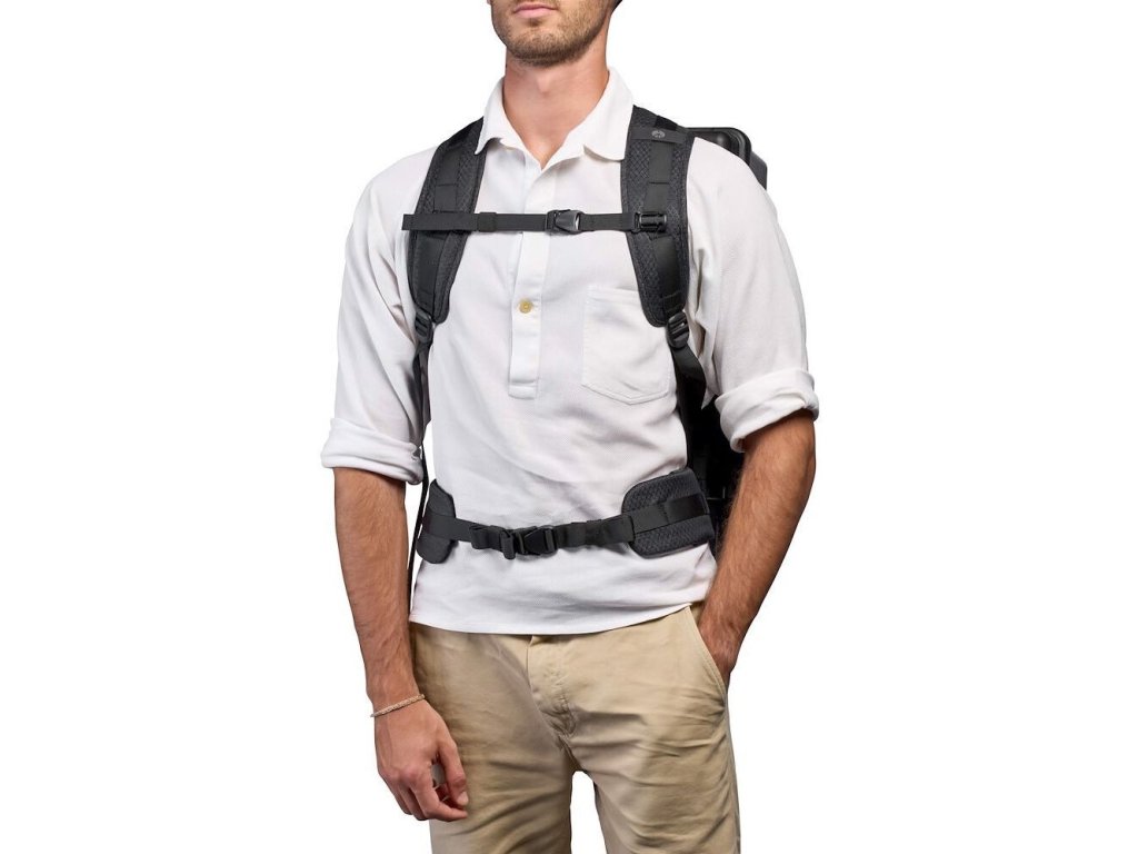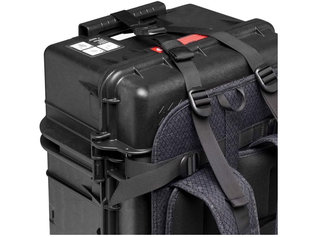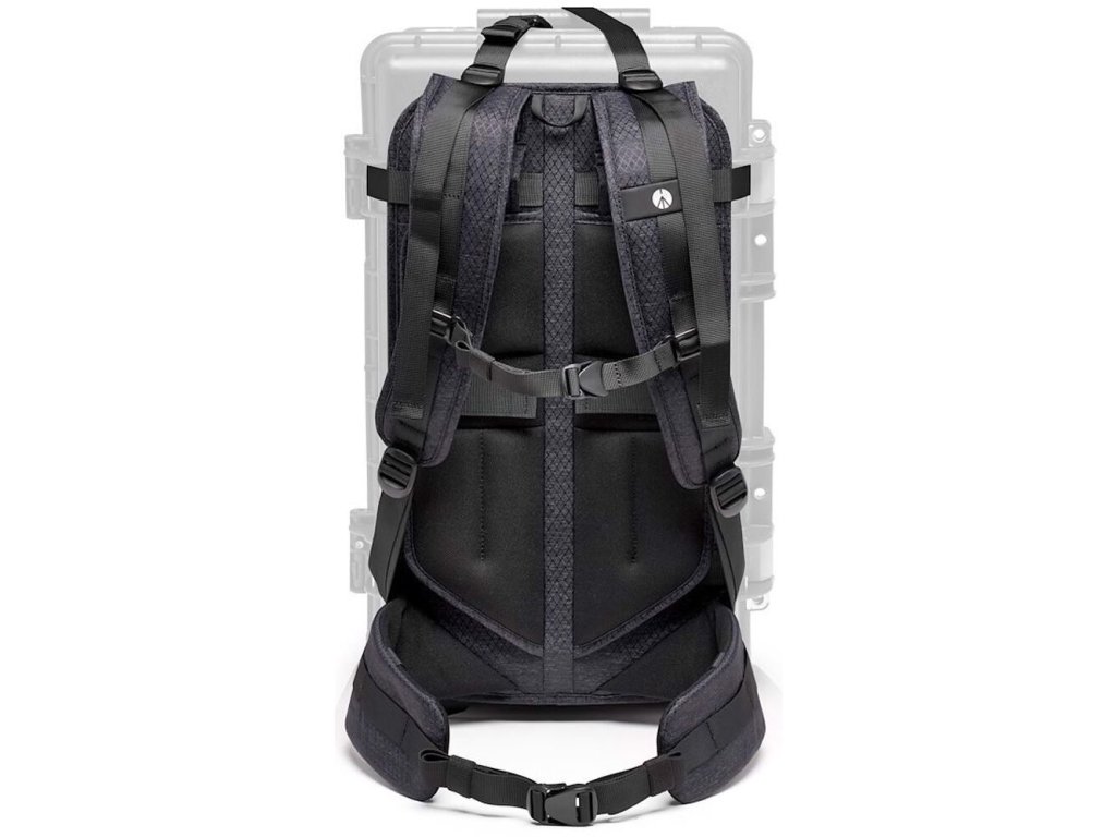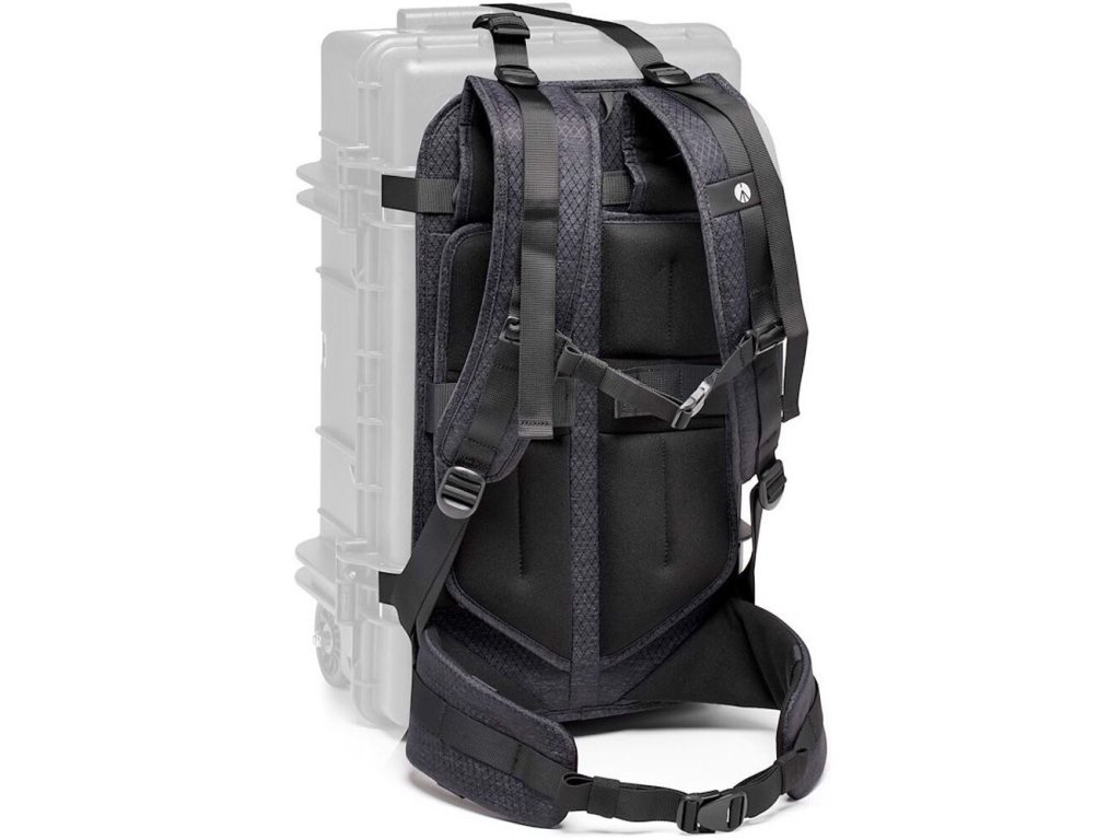 Pomocou systému Manfrotto Pro Light Reloader Tough Harness System môžete nosiť ich pevný kufor na kolieskach ako batoh. Tento systém rovnomerne rozkladá hmotnosť kufra, čo uľahčuje pohyb po nerovnom, kamenistom alebo členitom teréne. Postroj je vybavený plne polstrovanými popruhmi batohu, stabilizačným hrudným popruhom a bedrovým pásom a k puzdru sa pripevňuje pomocou štyroch popruhov, ktoré zaisťujú bezpečné spojenie.
