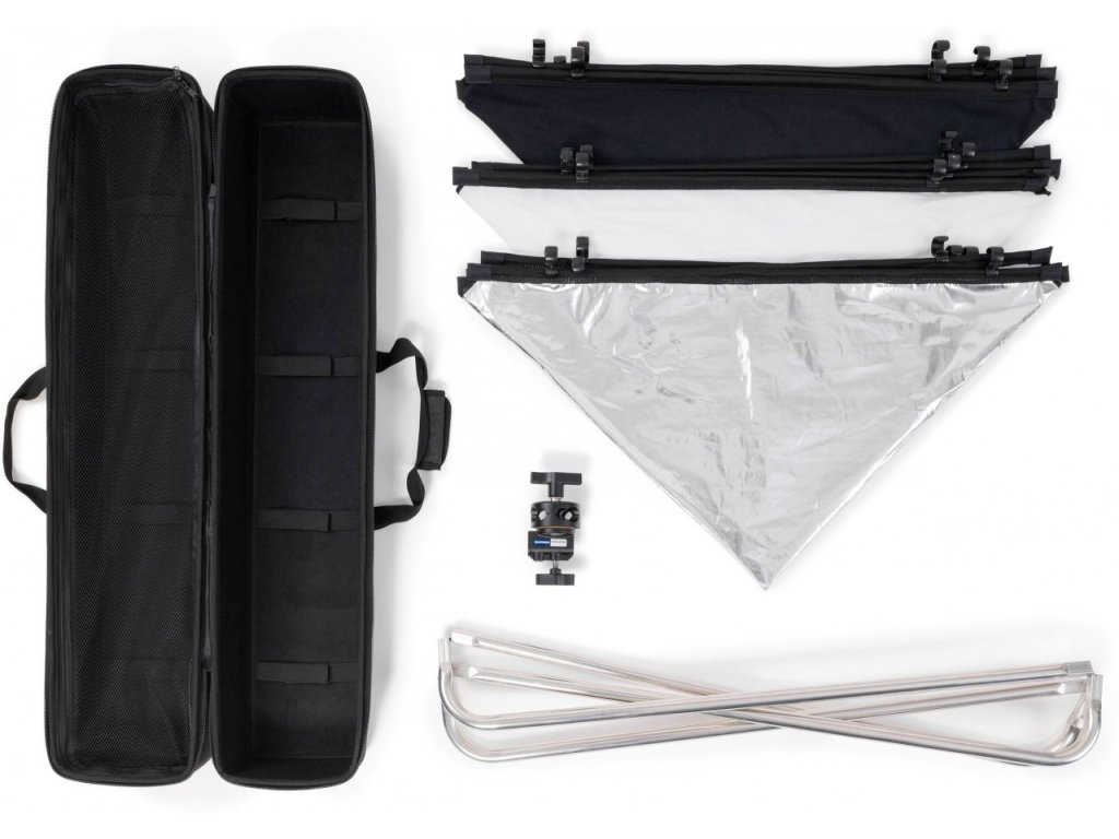 - Obojstranná strieborná/biela látka má dvojaký účel. Strieborná strana ponúka vysoko odrazivosť svetla skvelú pre prácu na dlhé vzdialenosti, kedy skvele vykresľuje tienisté plochy, alebo poskytuje vysoko kontrastné svetlo na kontúrach a všetko bez farebného skreslenia.