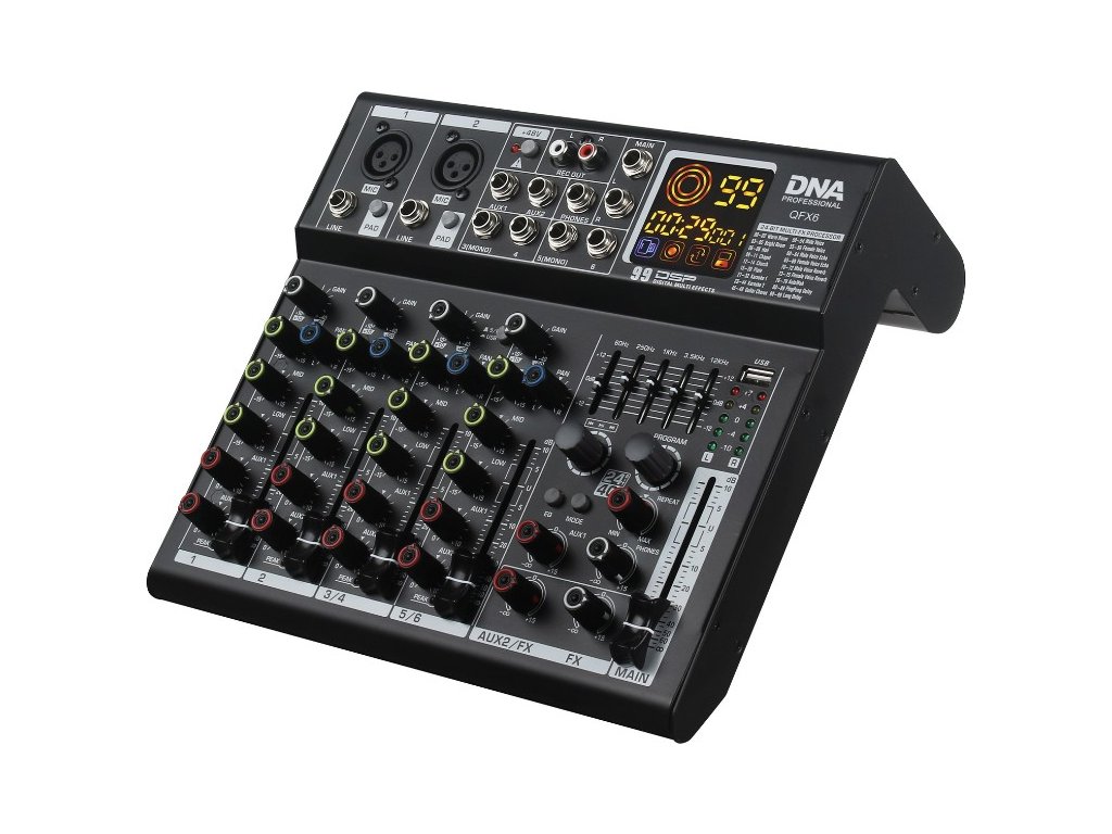 DNA QFX6 je profesionálny analógový mixážny pult s Bluetooth, vybavený šiestimi mono vstupnými kanálmi, slúchadlovým výstupom (jack 6,35 mm), dvoma AUX výstupmi, dvoma REC OUT výstupmi (cinch/RCA), ovládaním panorámy kanálového signálu, Phantomovým napájaním +48V, USB-B konektorom na pripojenie k počítaču, DSP procesorom a intuitívnym MP3 prehrávačom. Zariadenie sa skvele hodí ako pódiový mixážny pult počas menších estrádnych vystúpení a koncertov, v skúšobniach a tiež v domácom nahrávacom štúdiu.