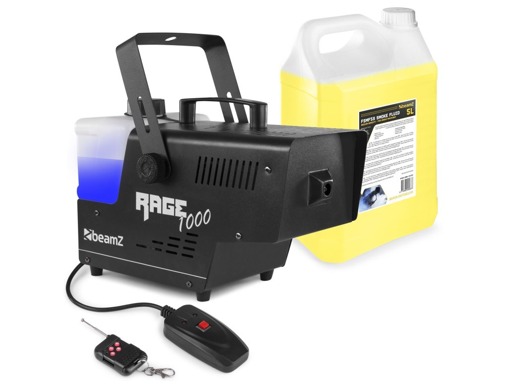 Výhodný set výrobníka hmly s bezdrôtovým diaľkovým ovládačom BeamZ RAGE 1000 1000W a kvapaliny štandardnej hustoty BeamZ FSMF5E-Y 5L.