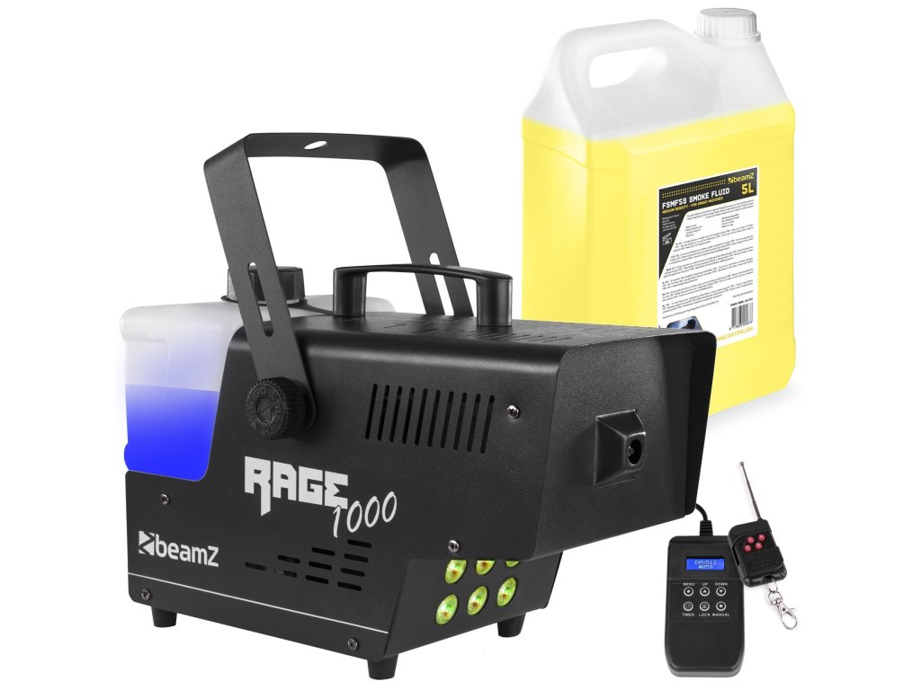 Výhodný set výrobníka hmly s bezdrôtovým diaľkovým ovládačom a LED podsvietením BeamZ RAGE 1000LED 1000W a kvapaliny strednej hustoty BeamZ FSMF5S 5L.